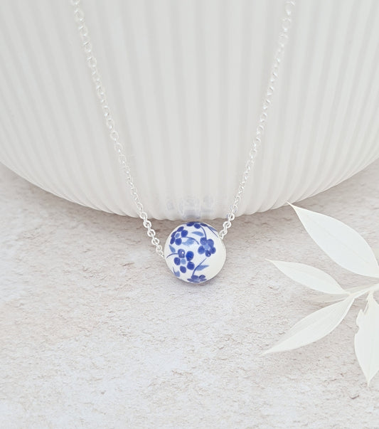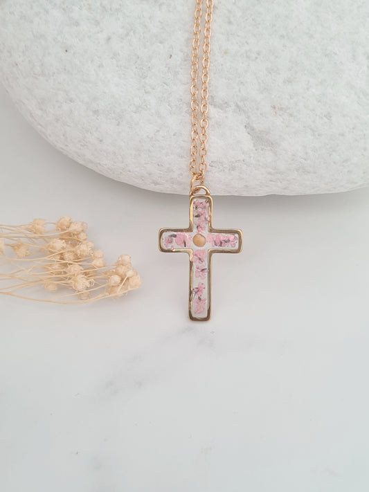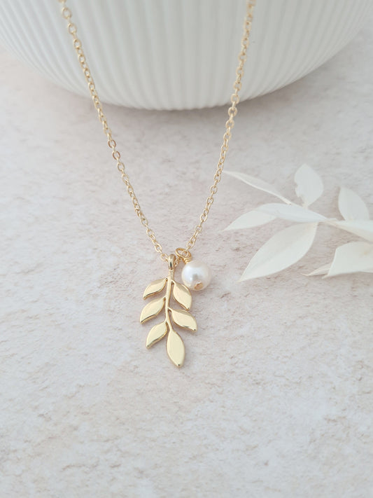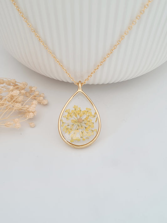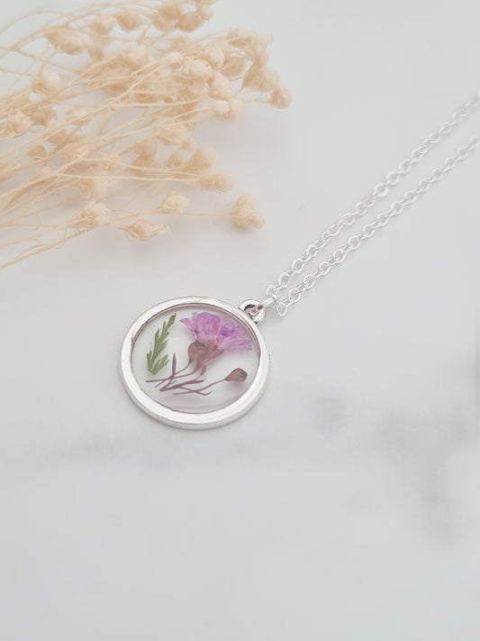 Mustard Seed Necklace with Fern Leaves and Pink Flowers