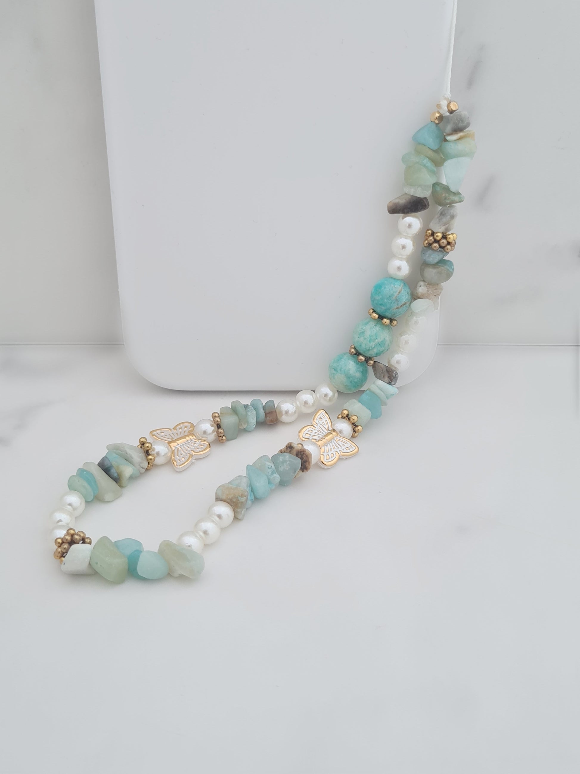 Real amazonite gemstone, butterflies and pearls make up this cute phone charm or phone strap. This charm measures 9in including the cord.
