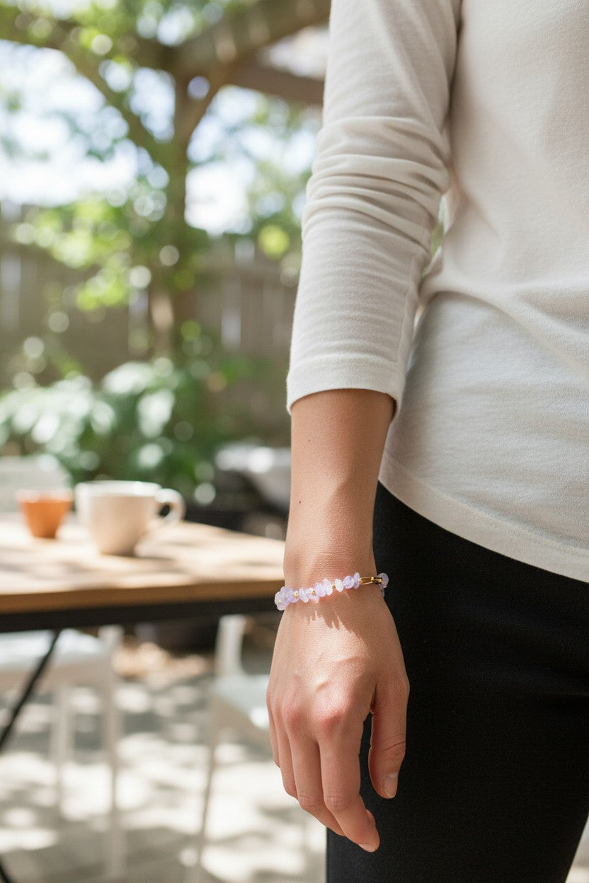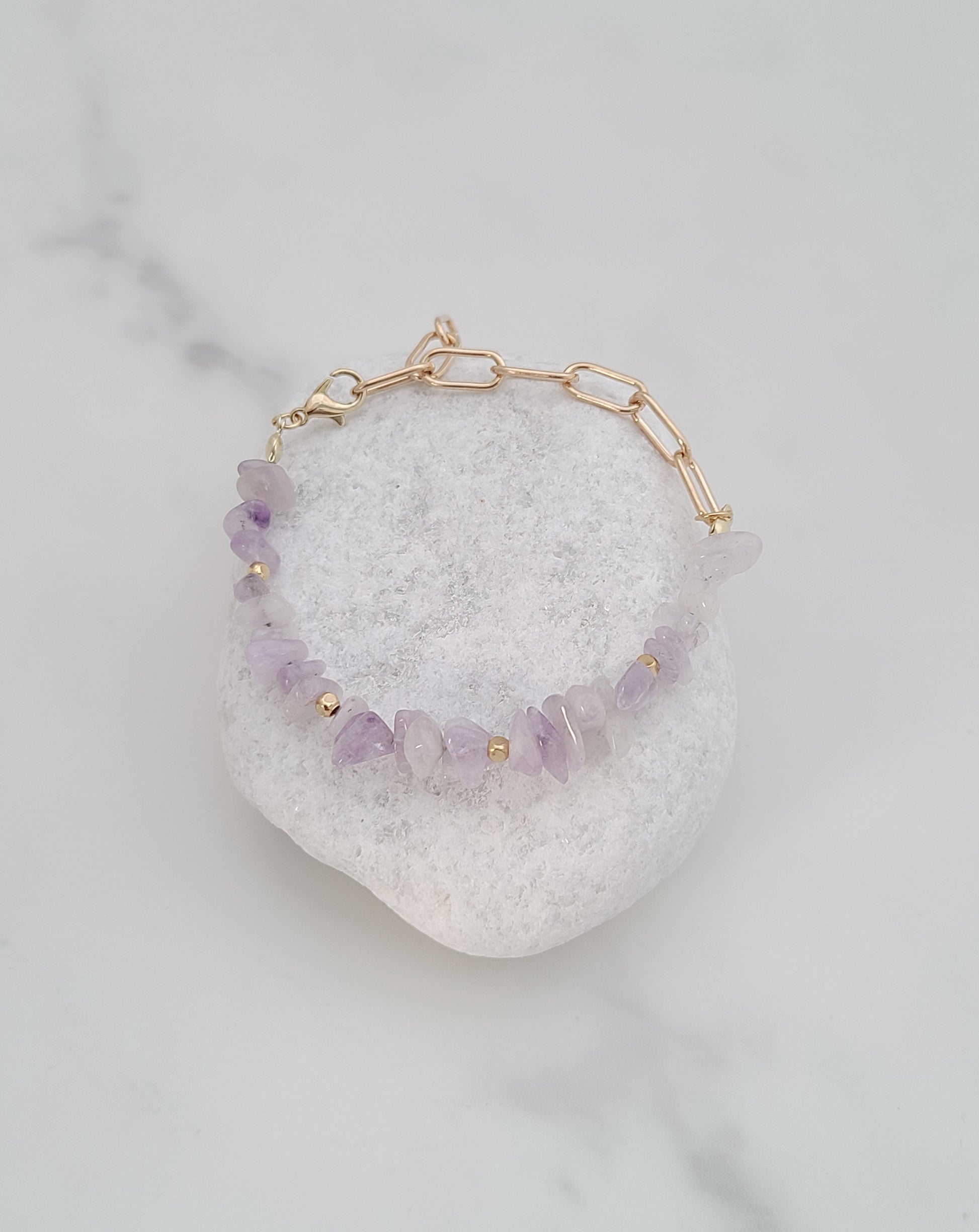 Amethyst chip gemstone beads and gold plated stainless steel paperclip chain make up this pretty bracelet. Amethyst is the birthstone of February. This bracelet is one size and fits up to 8in.