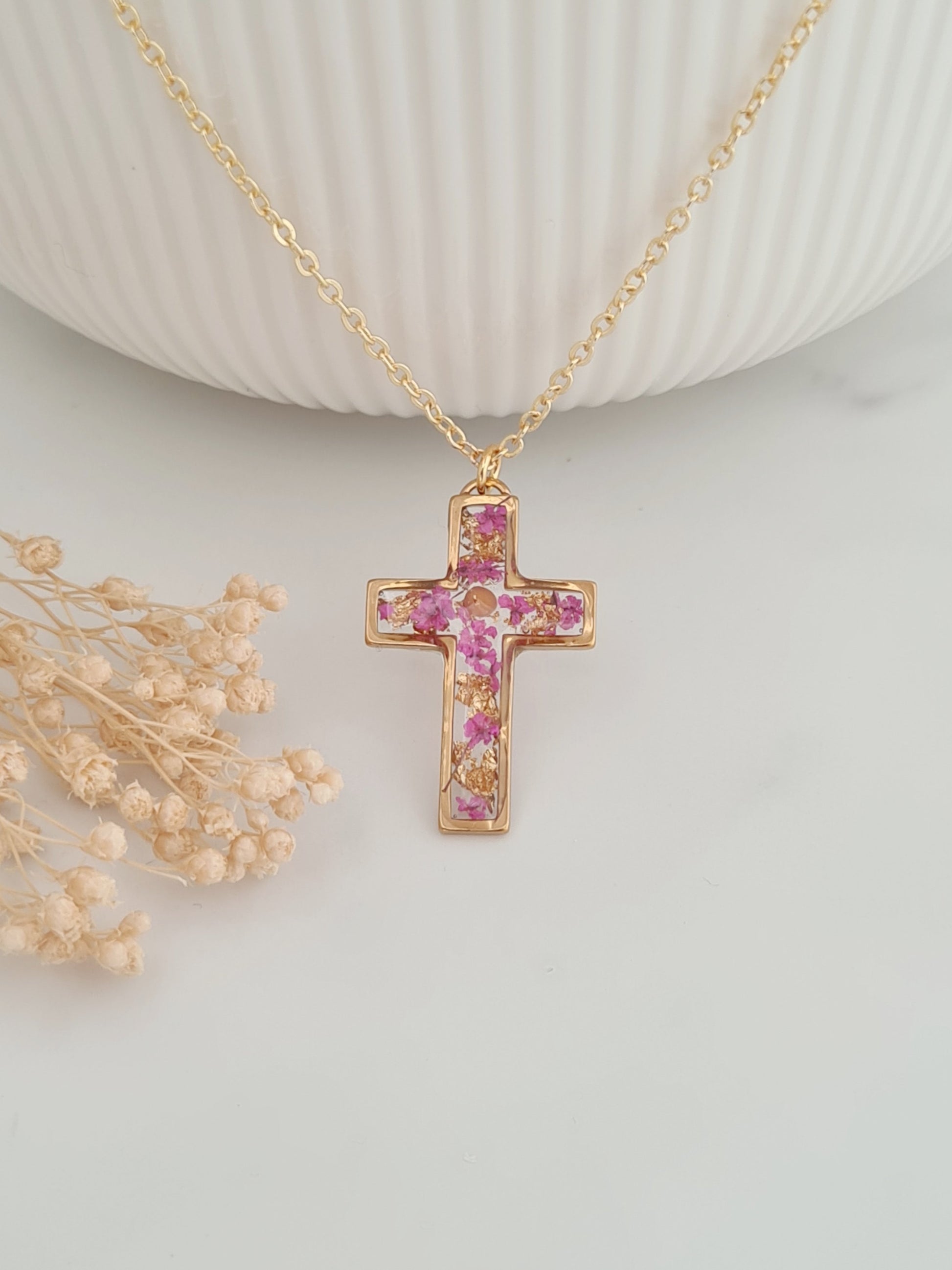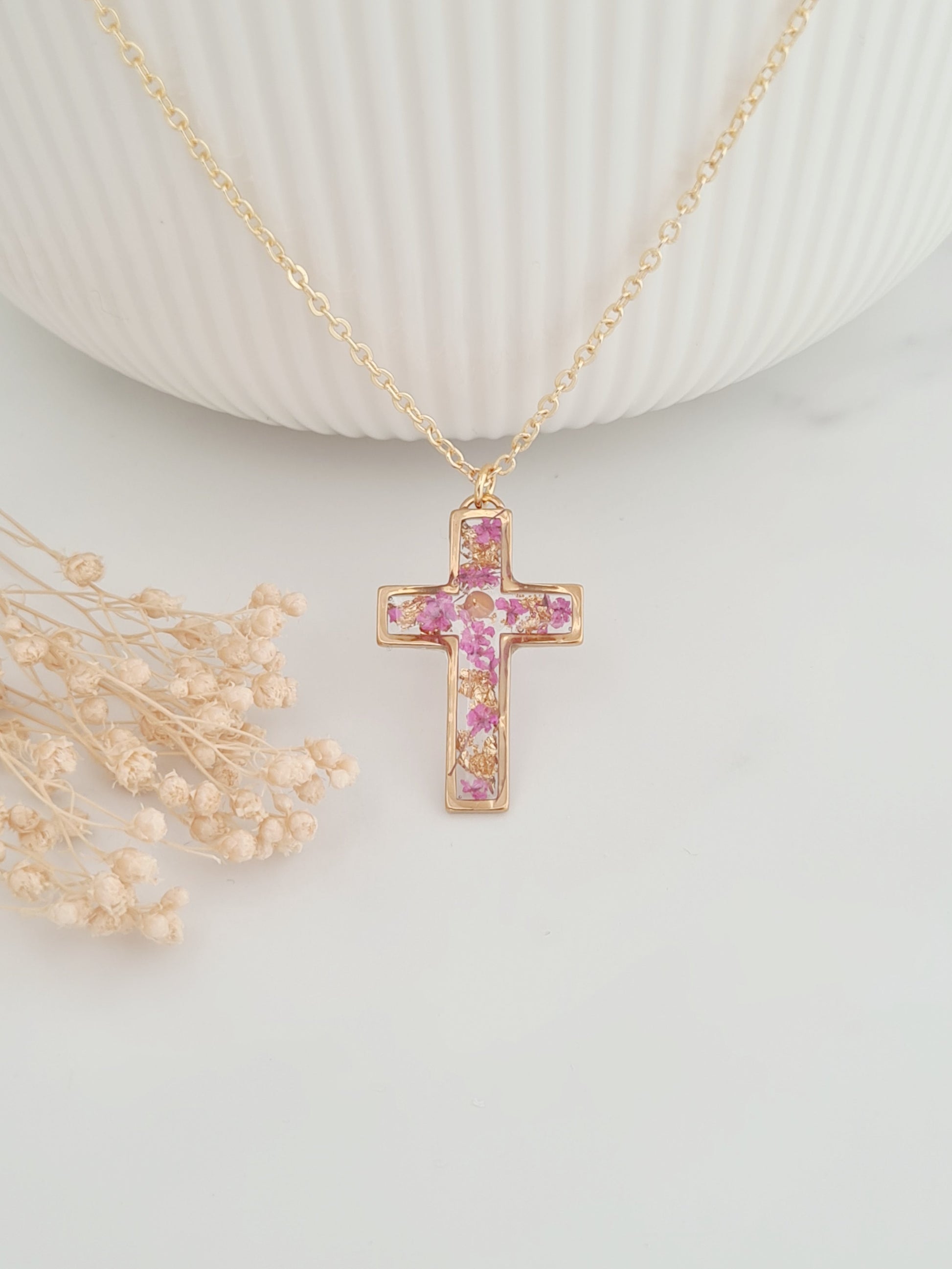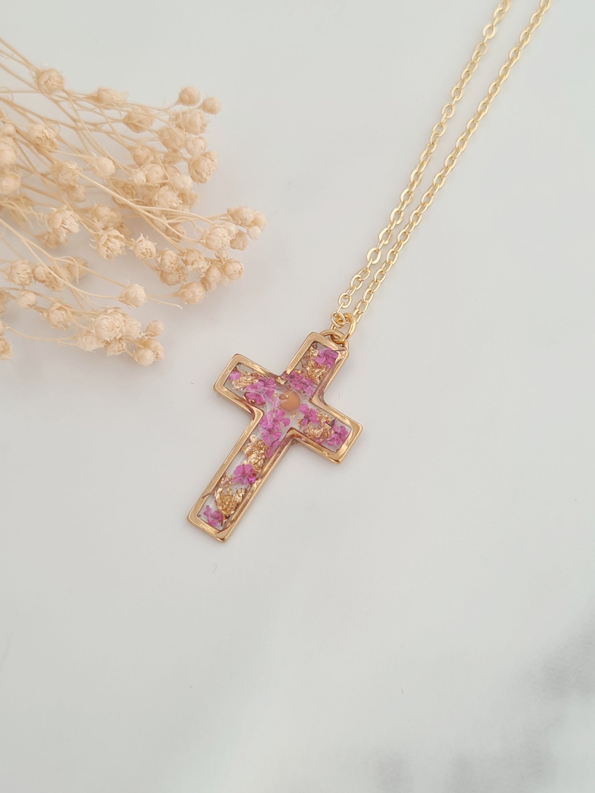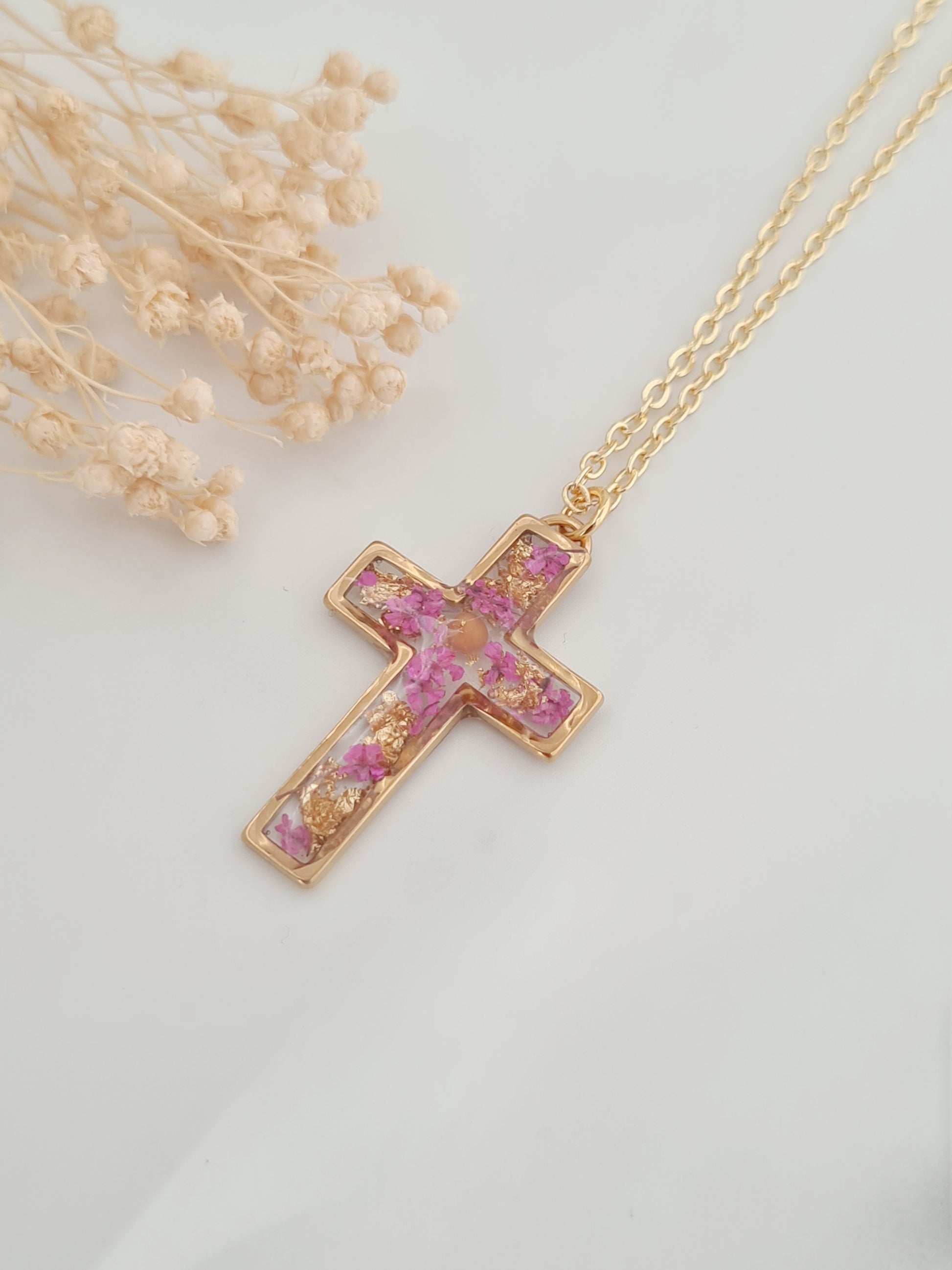 This cross pendant features real pink dried flowers, real gold leaf and a mustard seed which are preserved in resin in a gold plated cross.