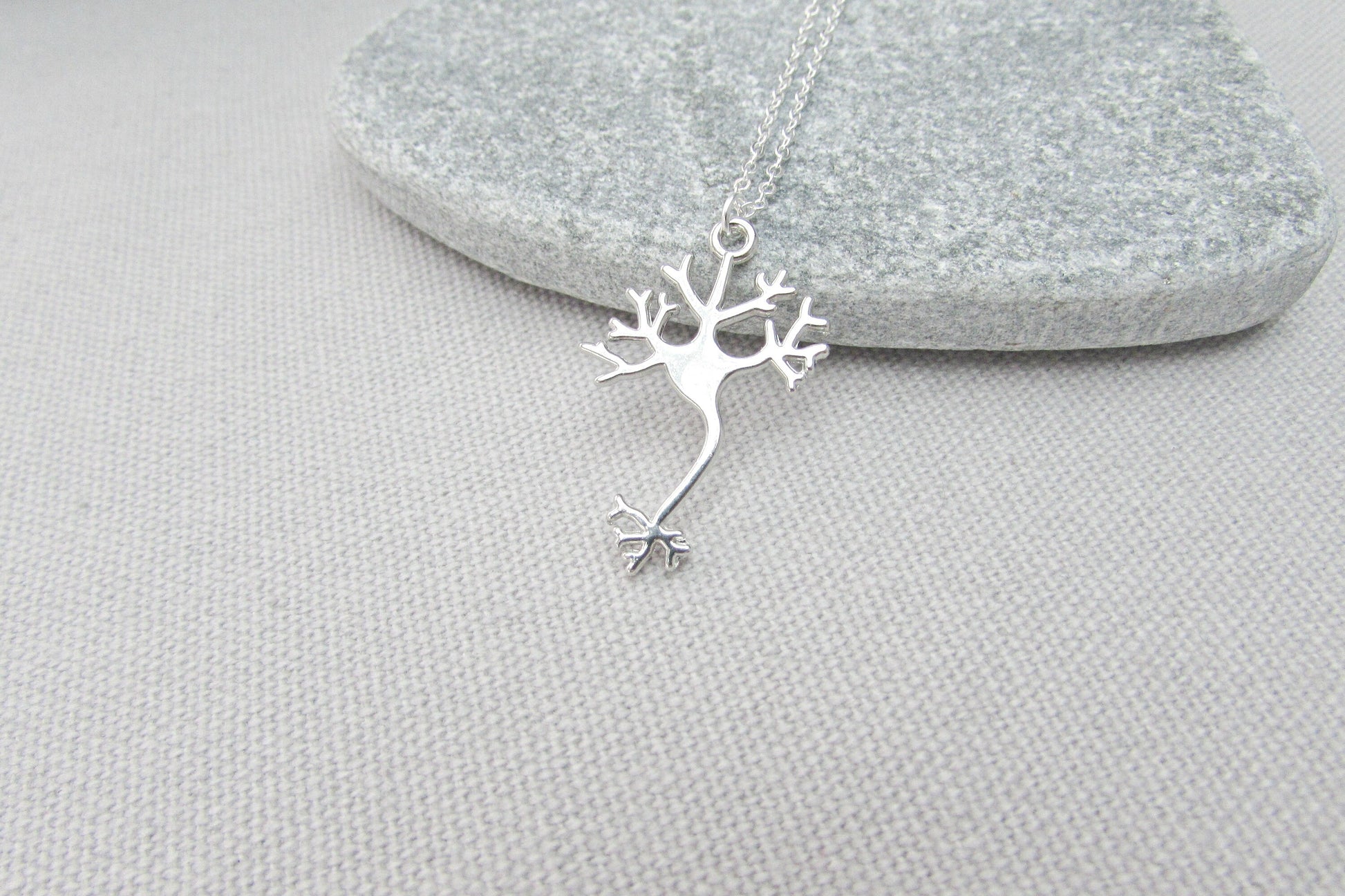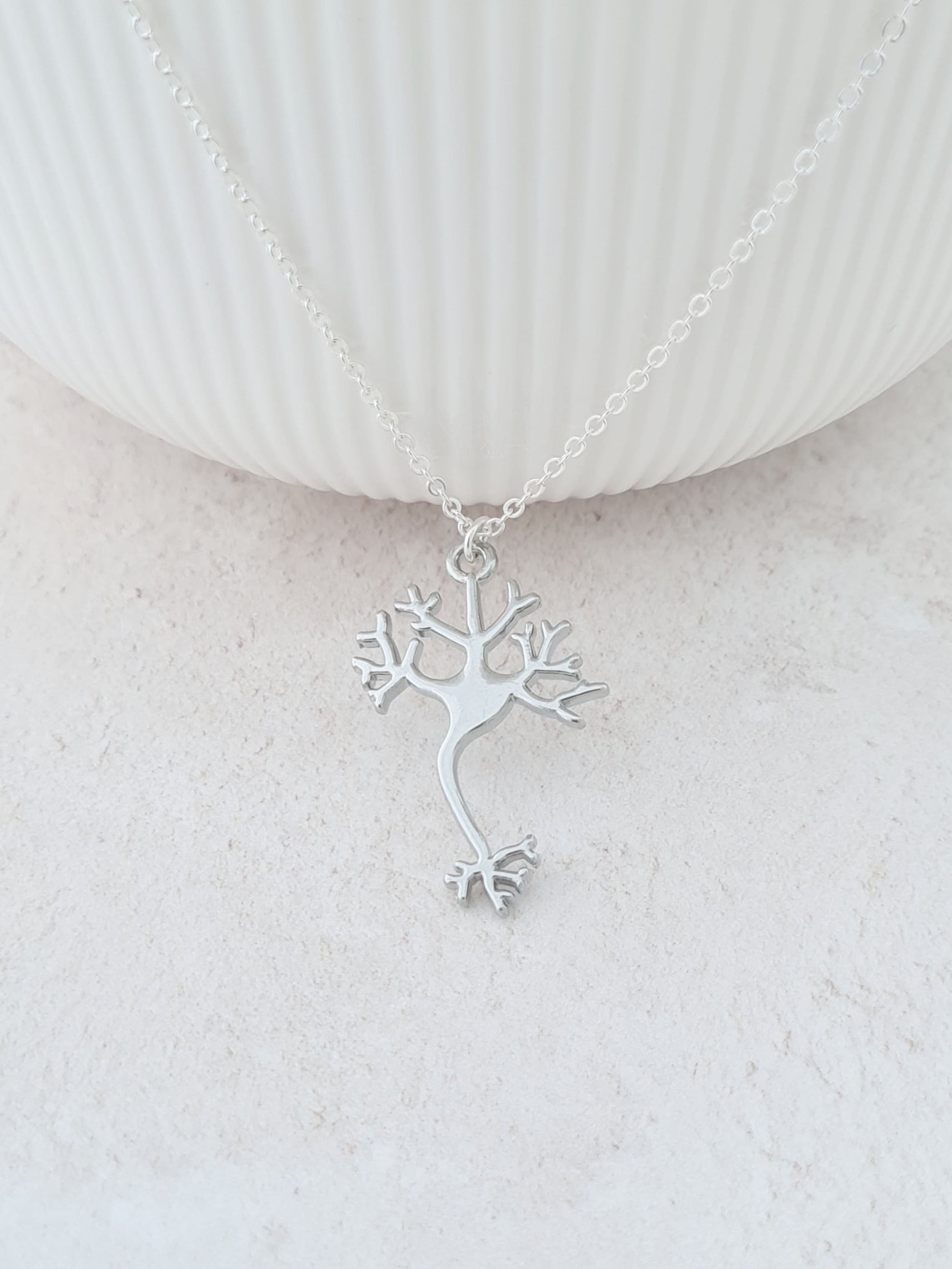 A minimalist neuron pendant necklace, which is silver plated and hangs from a fine silver plated chain.