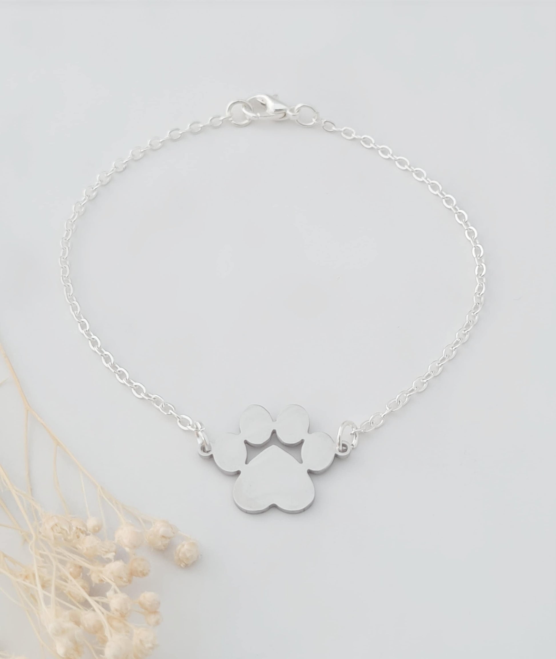 Gold or silver stainless steel, non tarnish dog or cat paw bracelet in gold or silver. The paws are mirror polished and super shiny. Dainty and lovely to wear.
