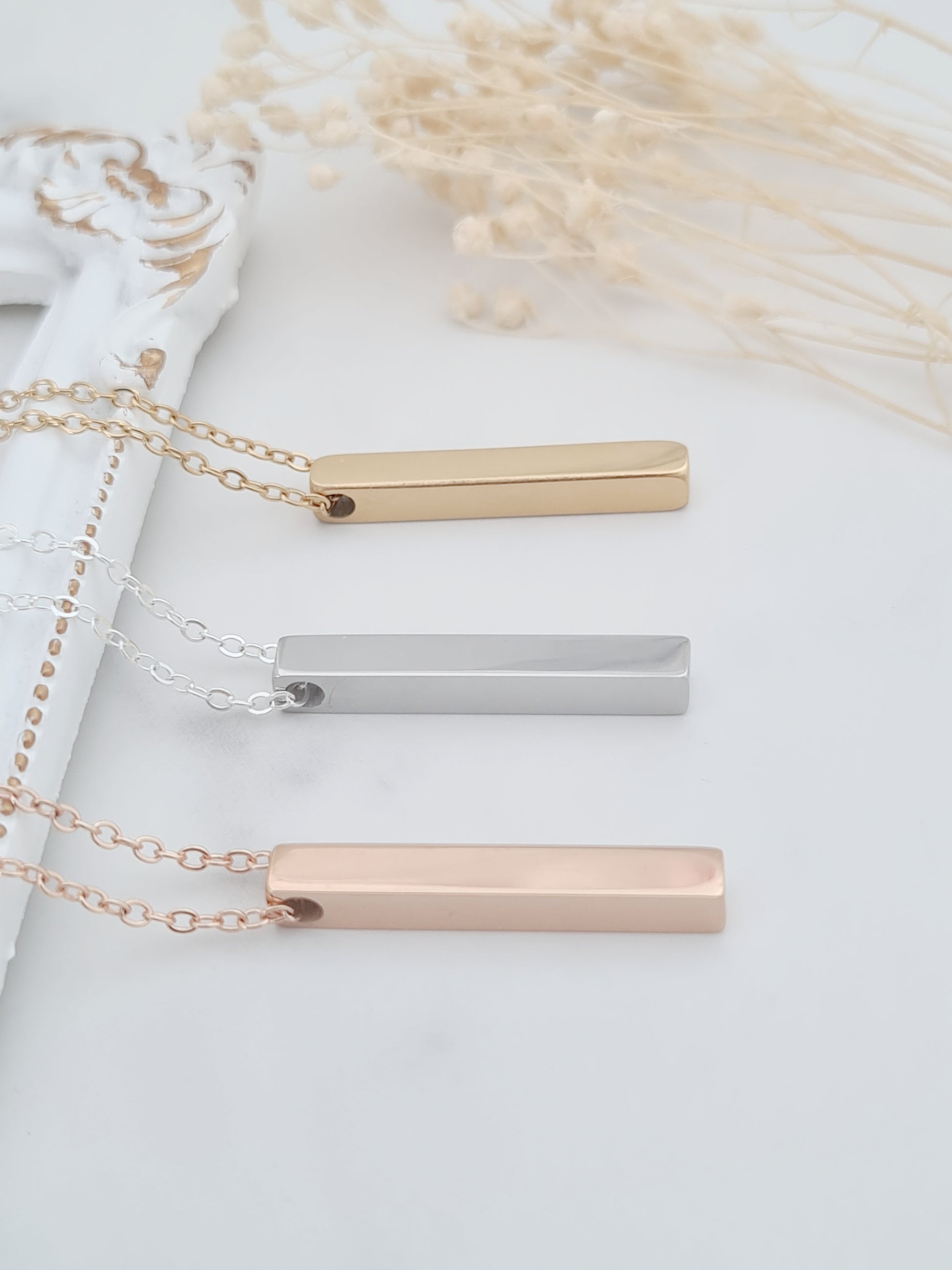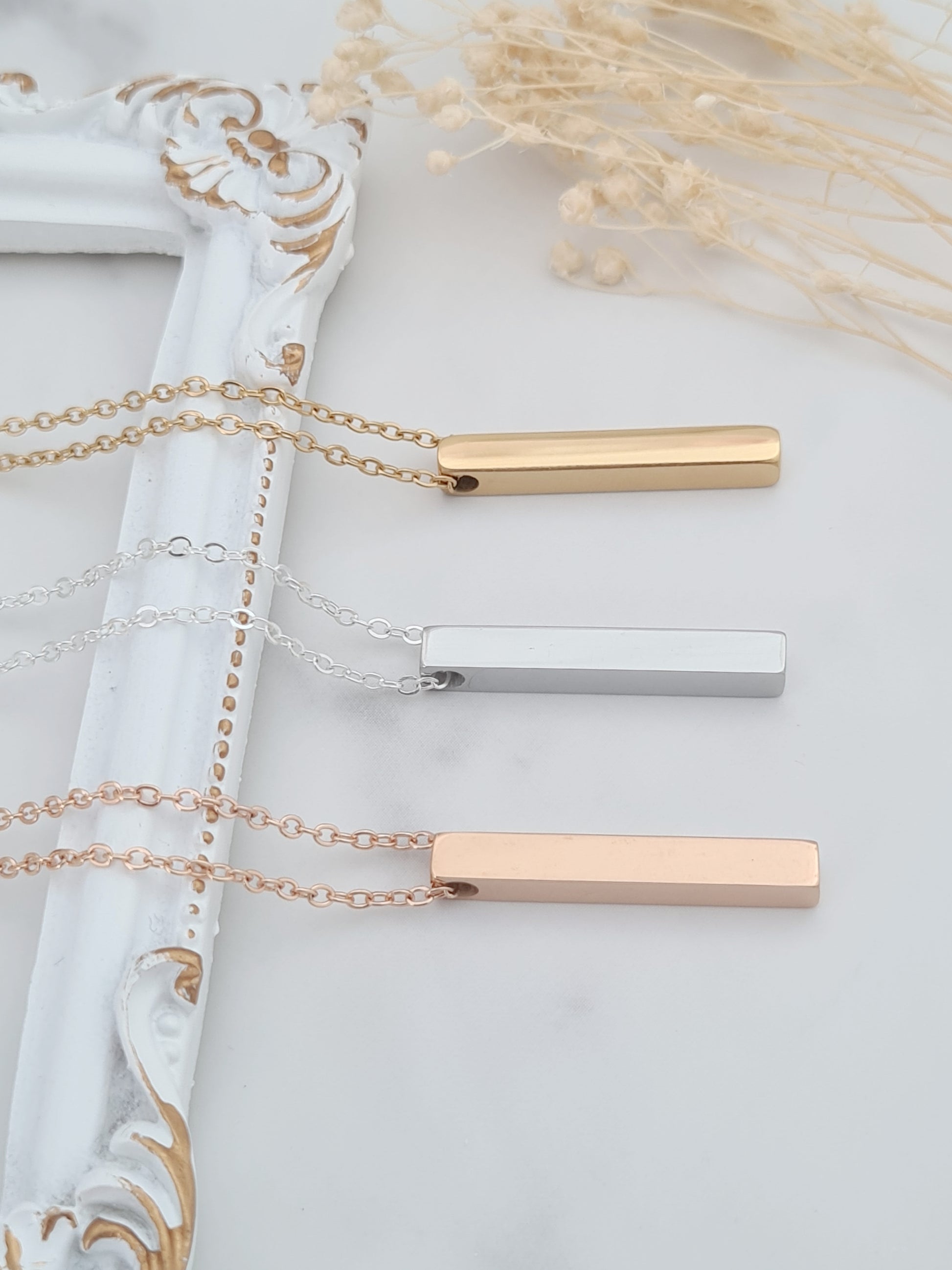 Minimalist stainless steel 3D vertical bar pendant in rose gold, gold or silver. The bar is simple and minimalist and hangs on a fine plated chain.