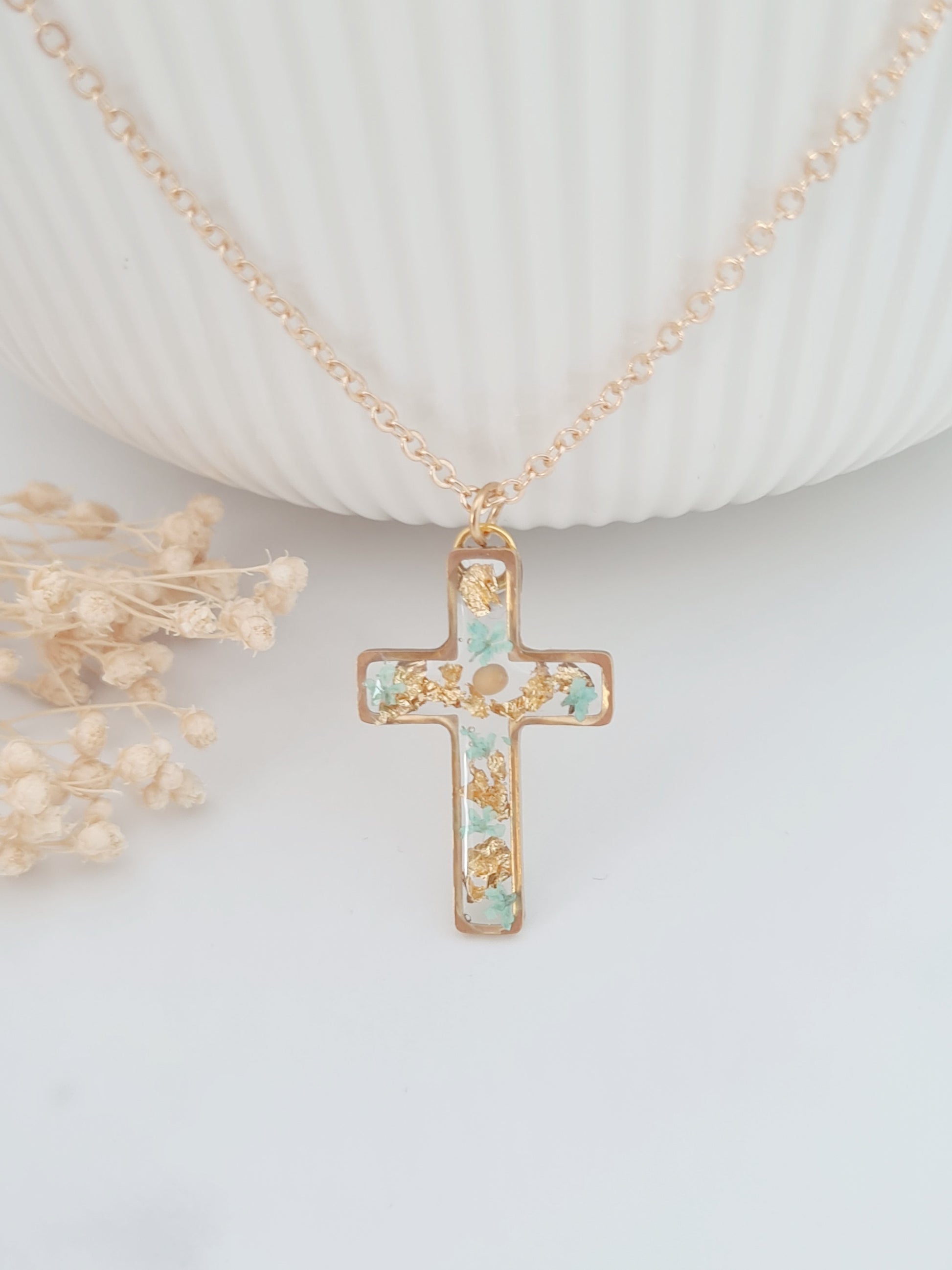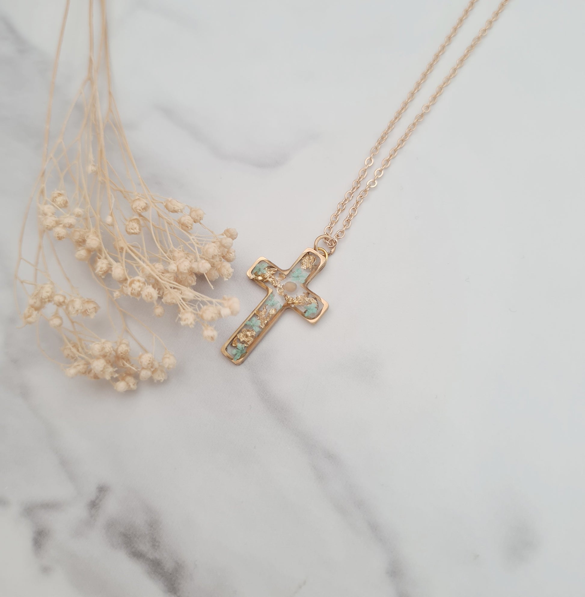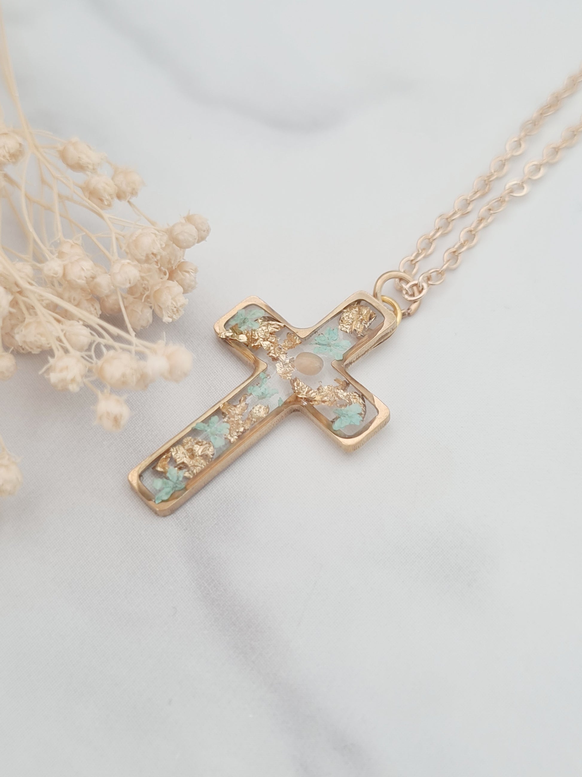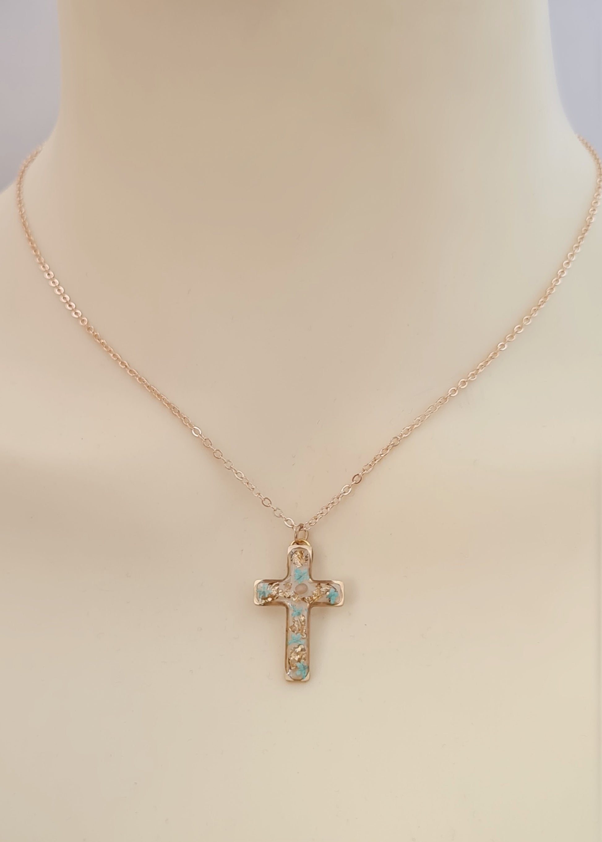 Real turquoise dried flowers, real gold leaf and mustard seed are preserved in resin and presented in a gold plated cross. A mustard seed represents growth, faith and dependence. The gold plated cross measures 22mm x 15mm and hangs on a fine gold plated chain.