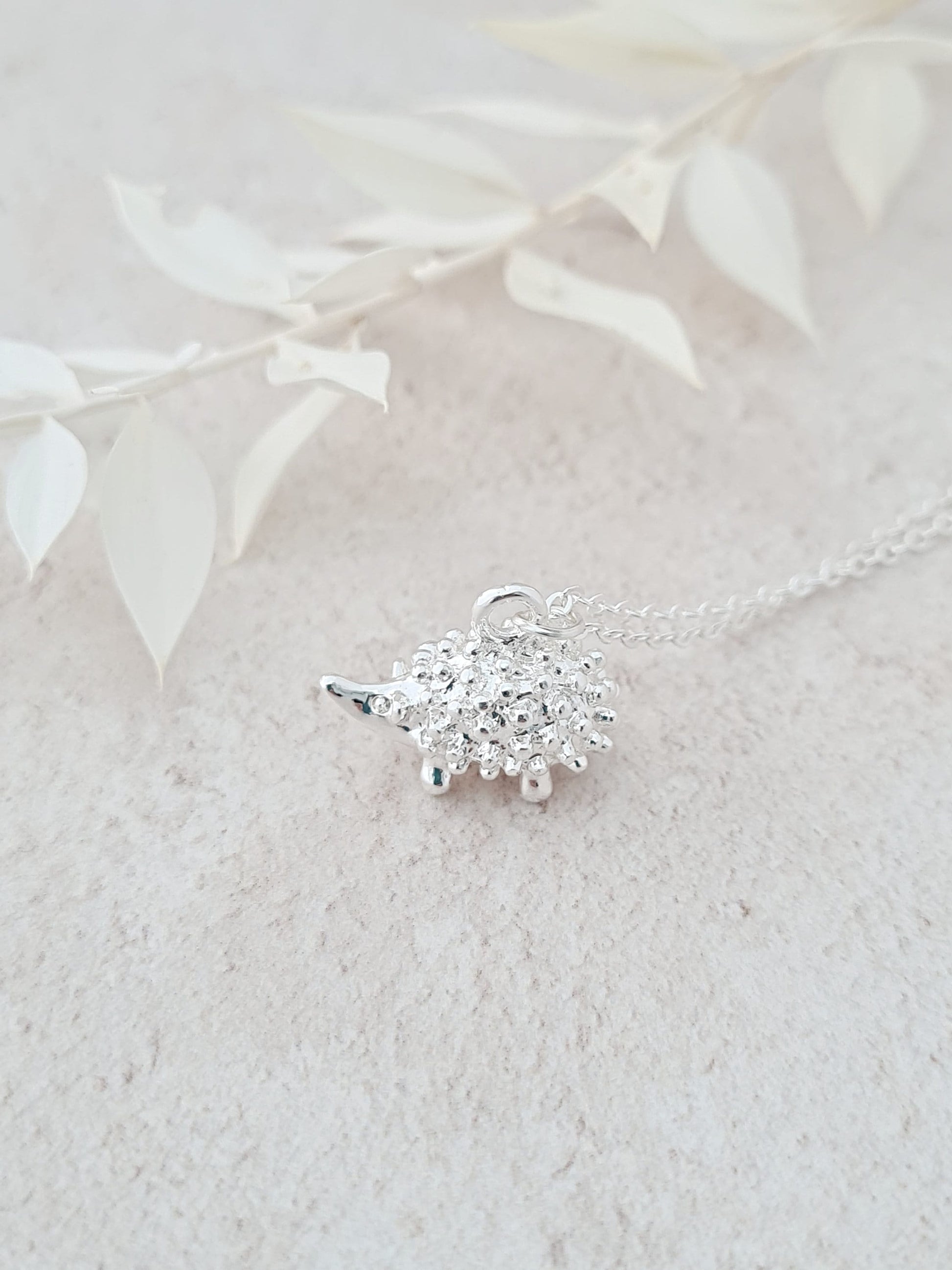 The hedgehog is bright silver plated and hangs on a fine silver plated chain. Perfect nature inspired necklace.