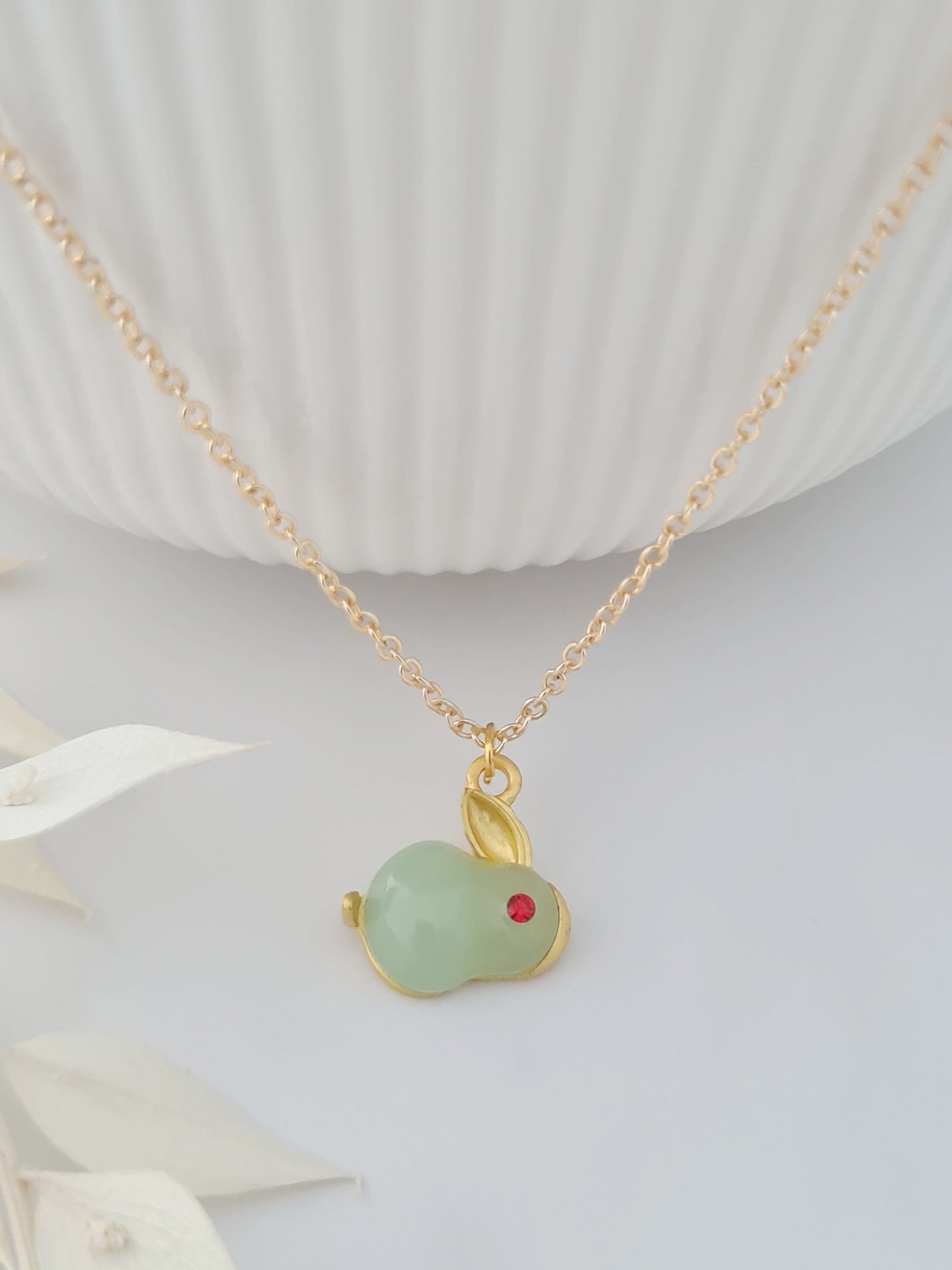Cute jade rabbit necklace. Pale green jade rabbit with red crystal eye. The pendant is 18K gold plated with a fine gold plated chain.