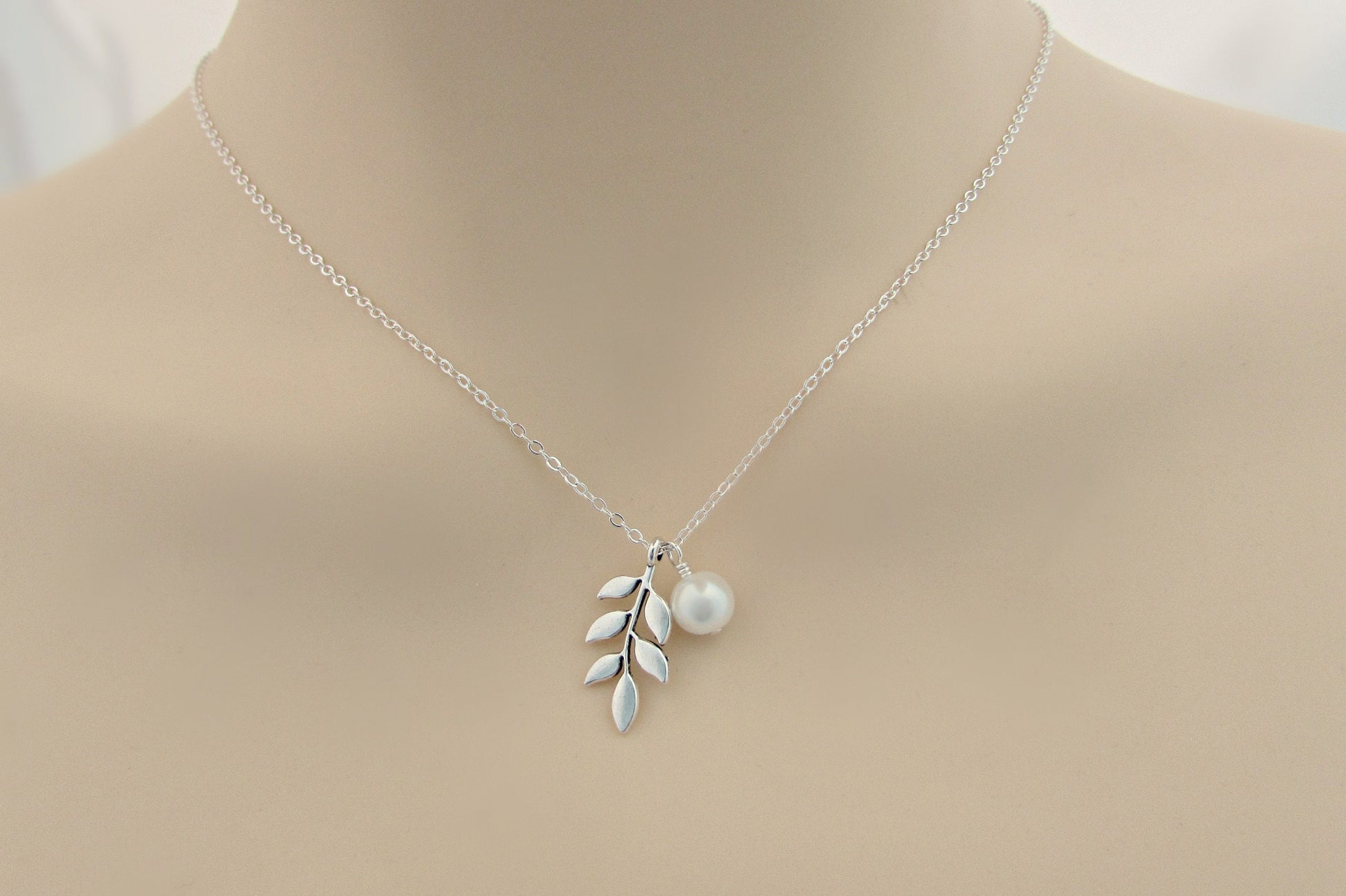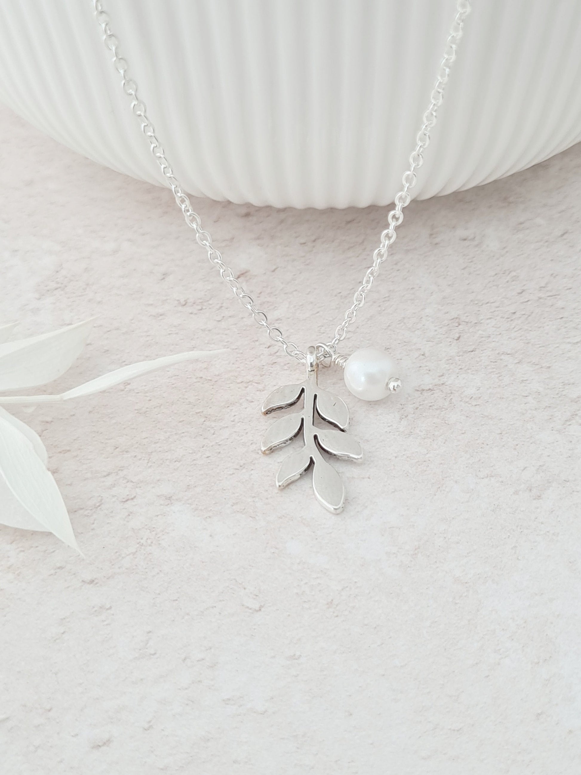 A necklace made from a dainty silver plated leaf hangs together with an 8mm glass pearl.