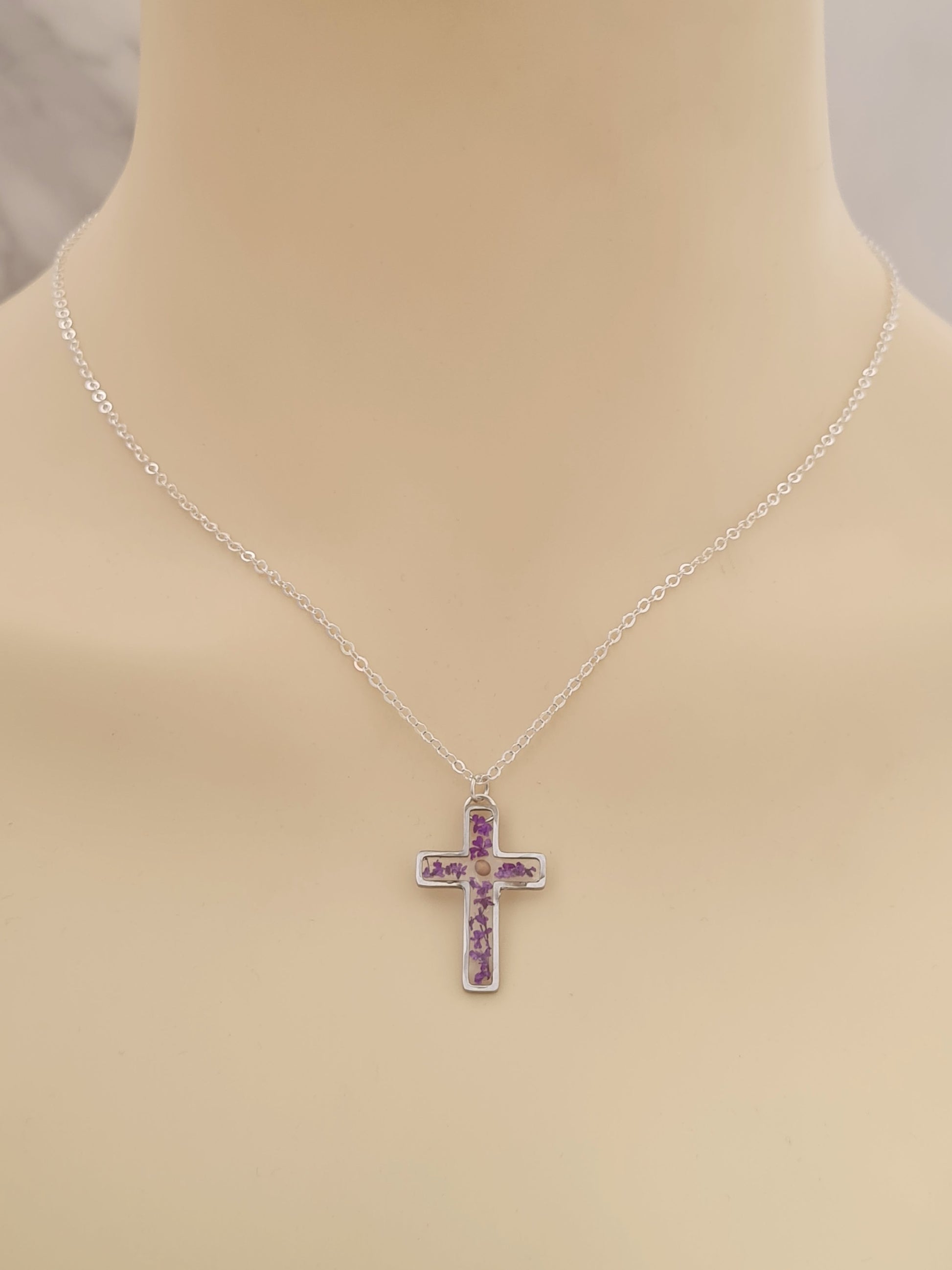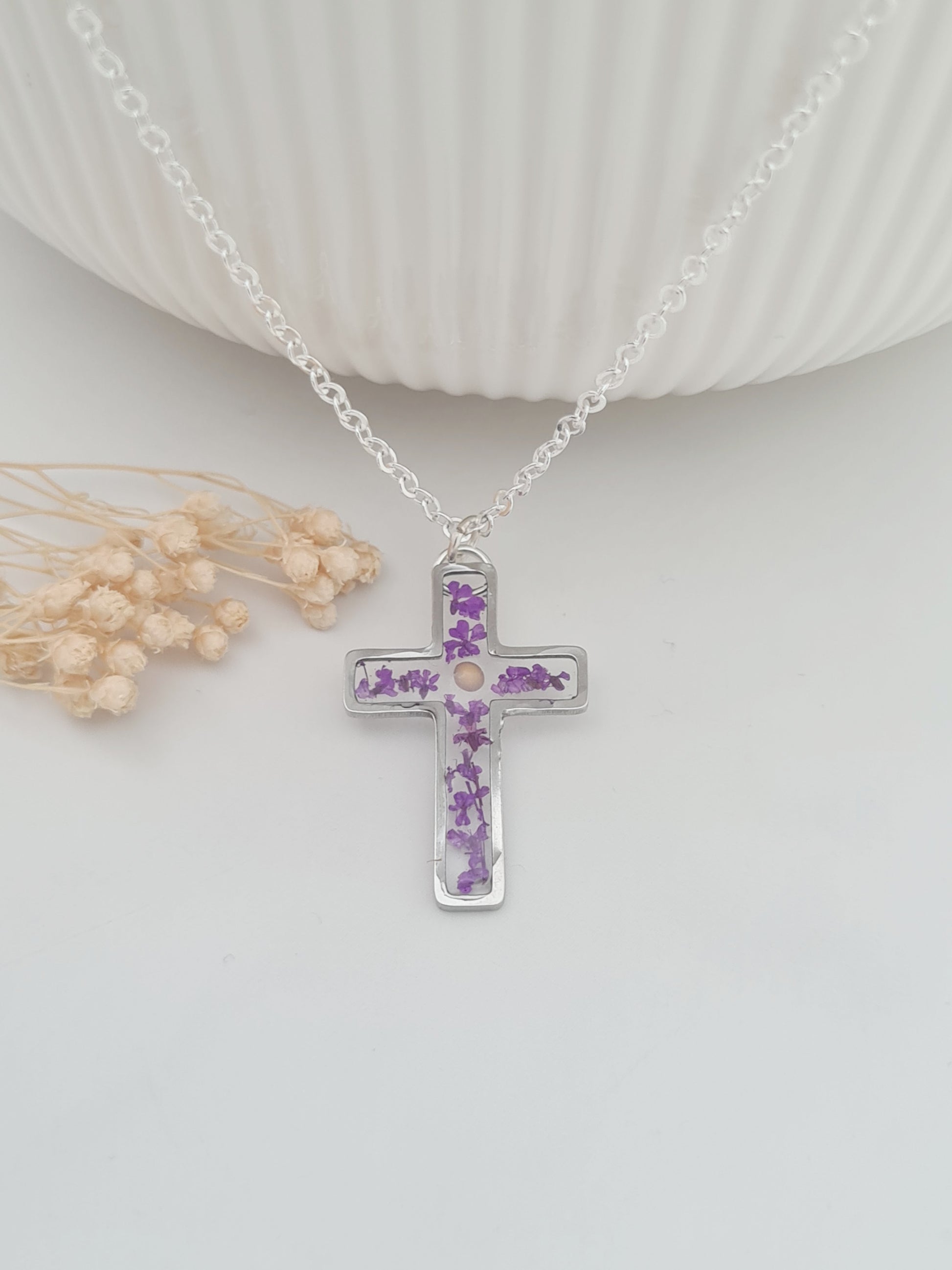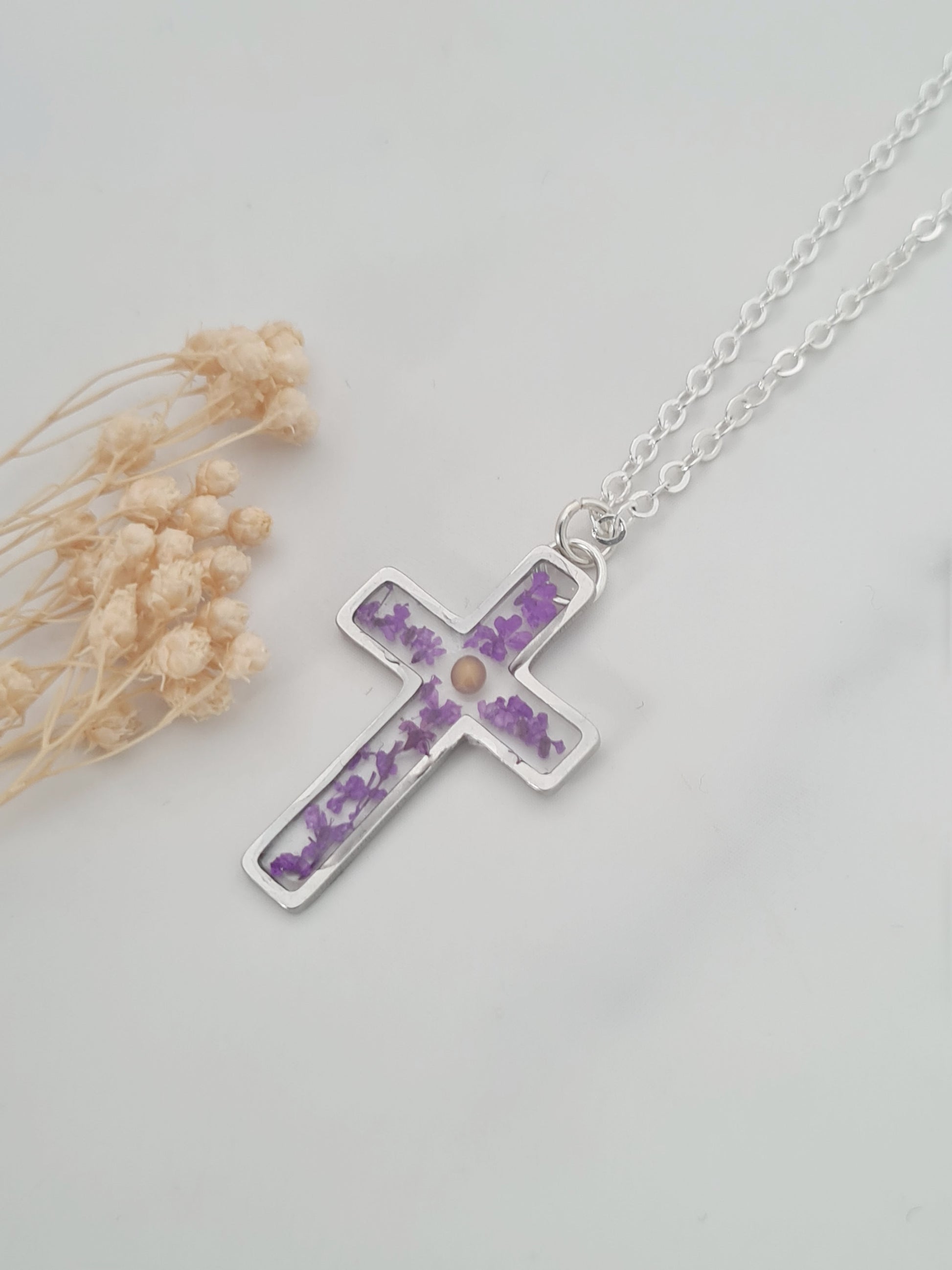 Purple flower and mustard seed cross pendant necklace. Real dried flowers are preserved in resin with a silver plated chain.