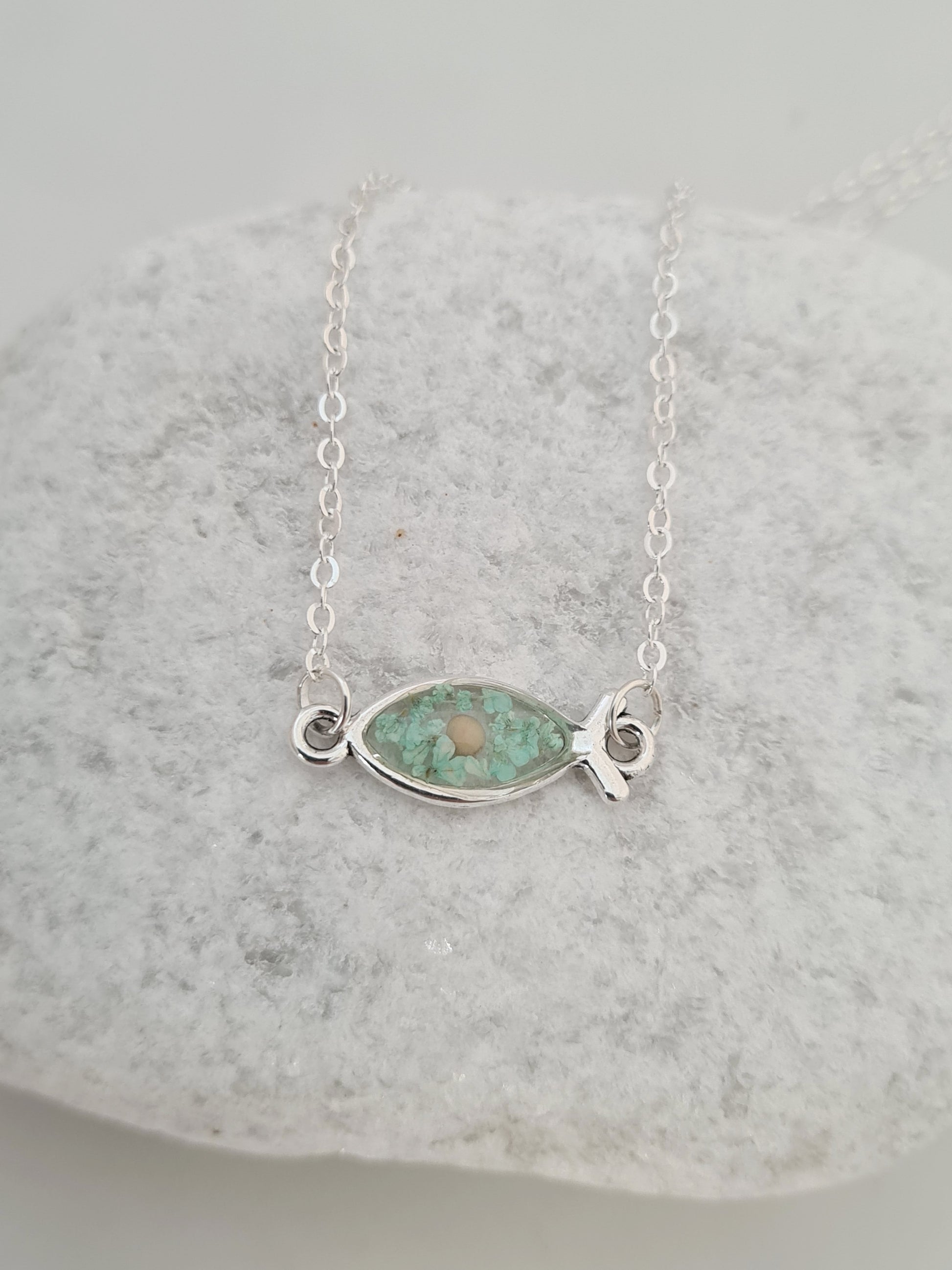 Ichthys fish and mustard seed Christian necklace. Dainty silver plated necklace with pale turquoise flowers and mustard seed preserved in resin. Cute necklace gift. The fish measures 2cm width.