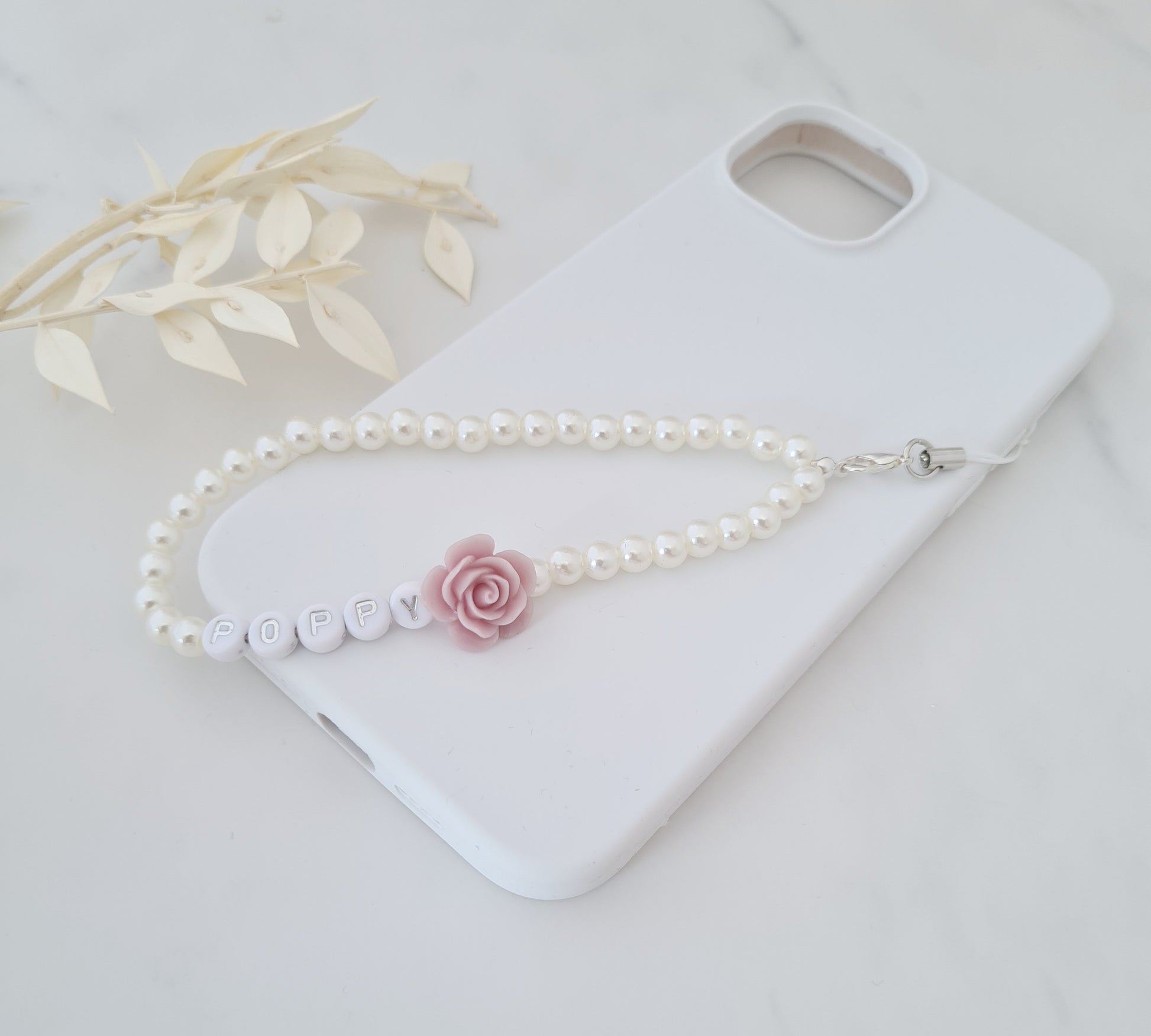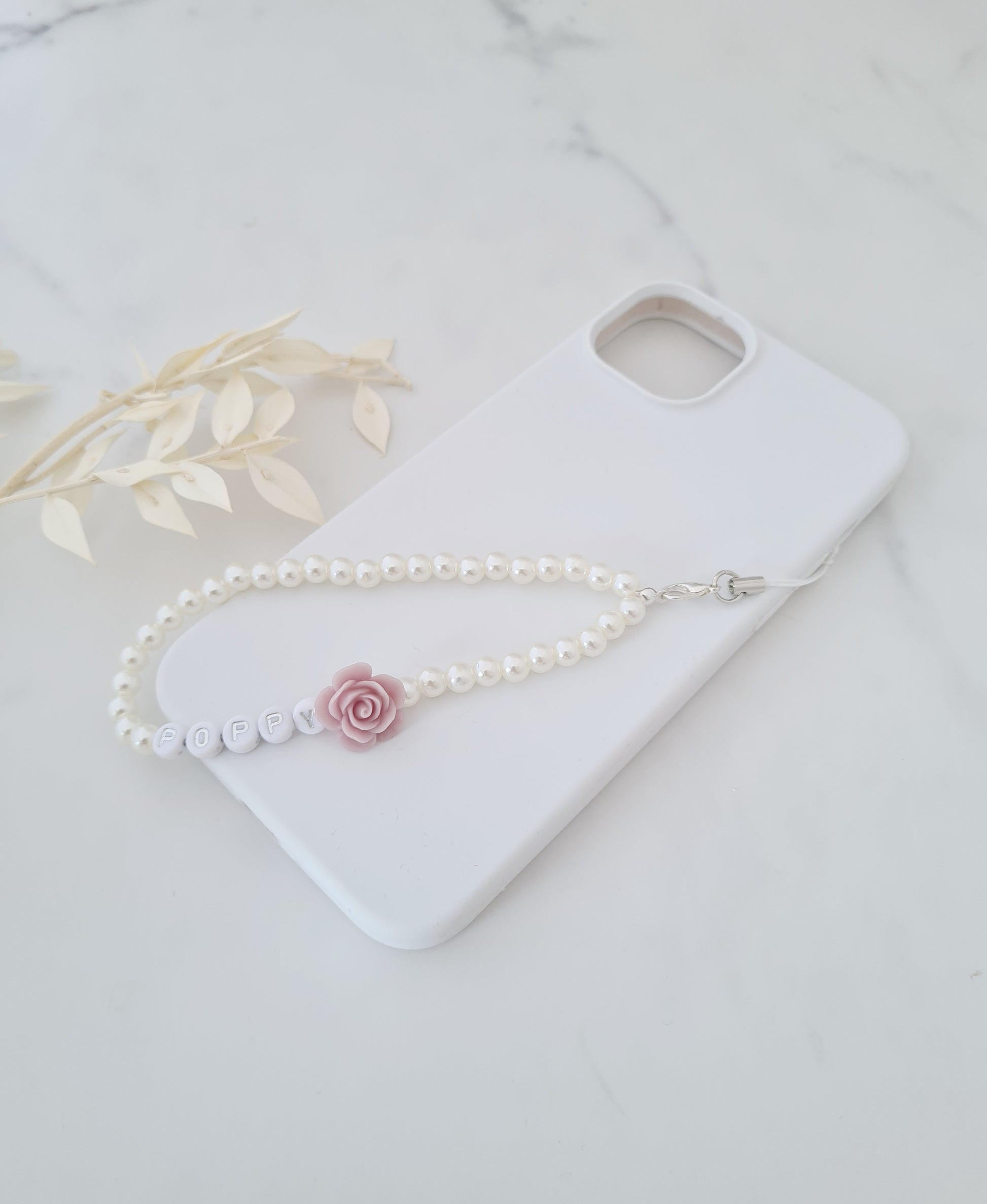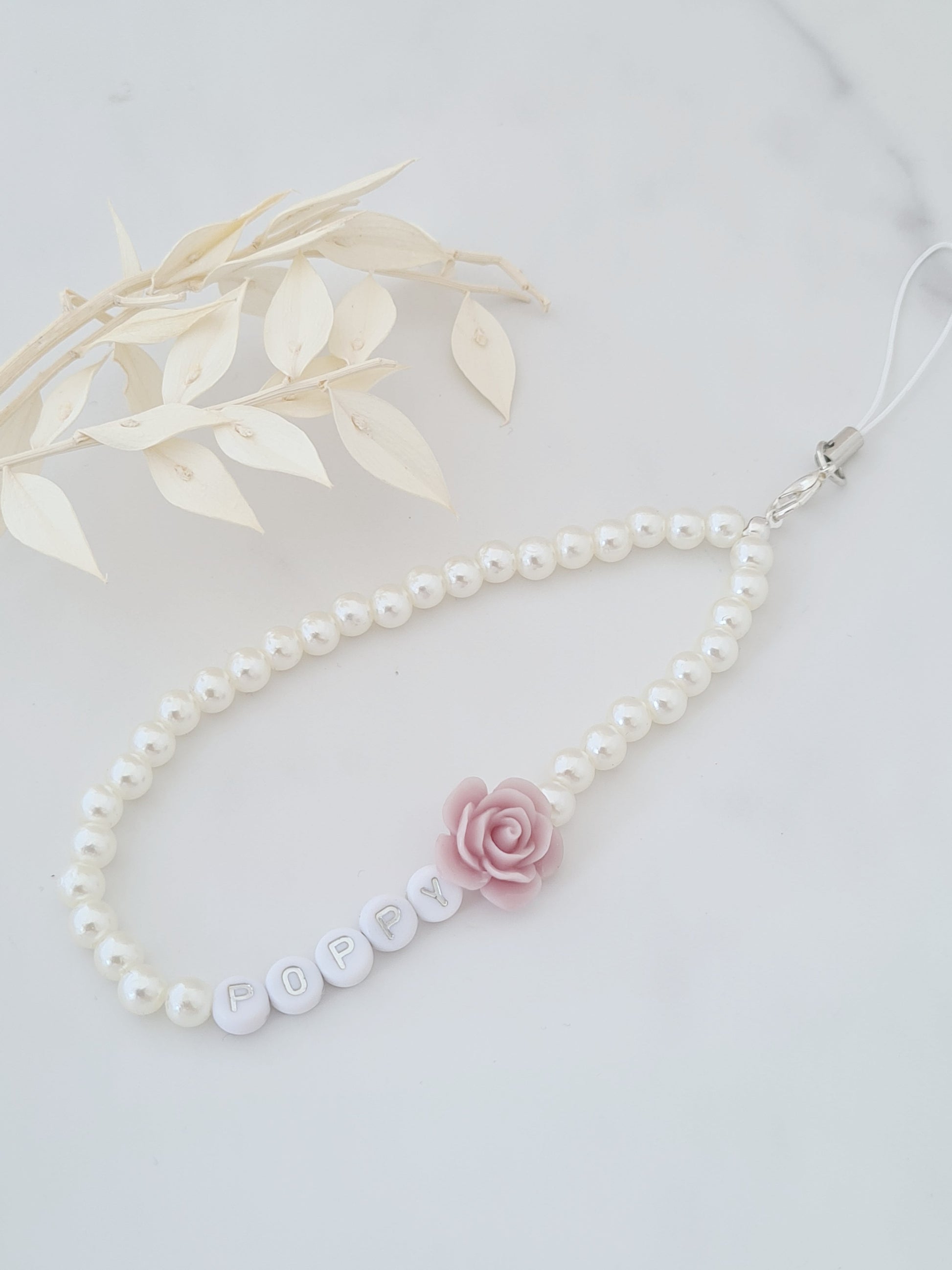 Pink rose personalised pearl bead phone charm/strap.