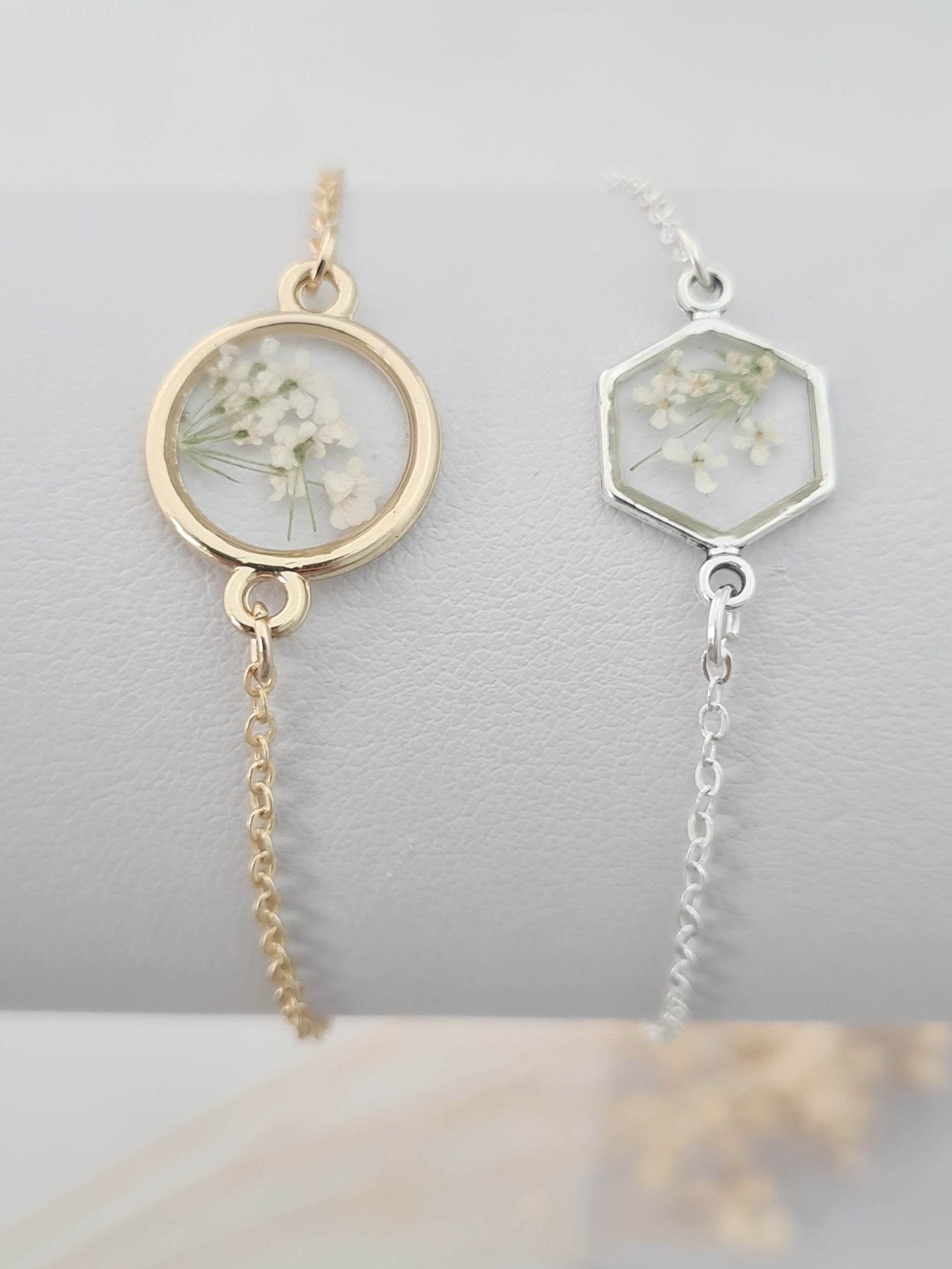 Pretty and dainty bracelet featuring real pressed baby's breath/gypsophila. Off white flowers tiny set in resin.