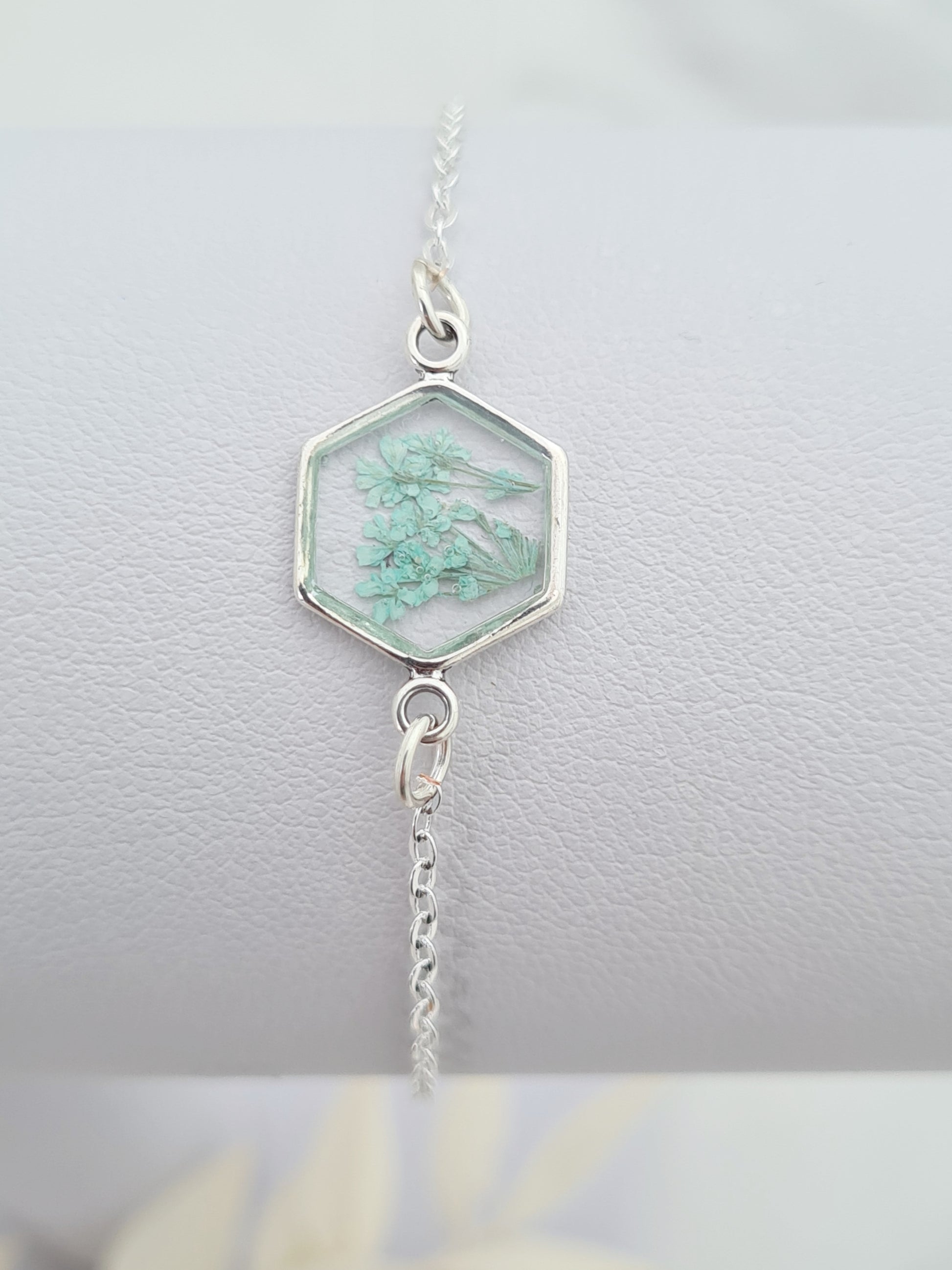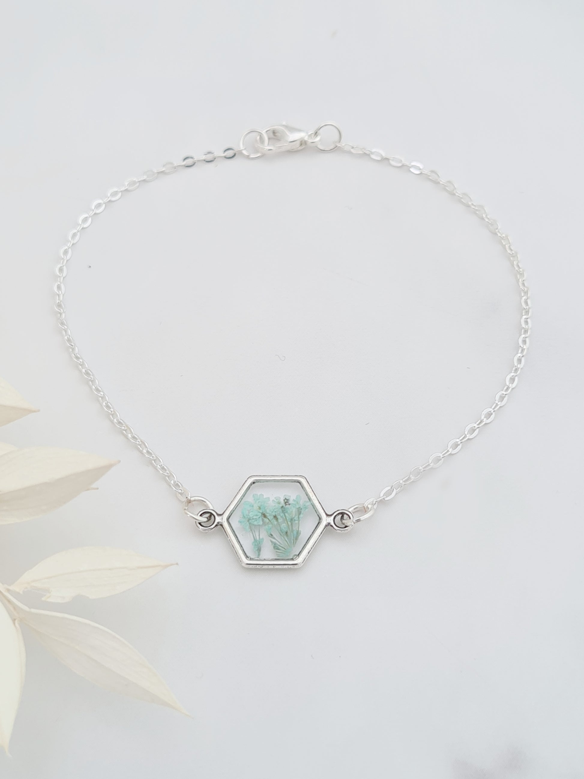 Tiny light turquoise flower bracelet. Pretty and dainty bracelet featuring real pressed blue gypsophila. These flowers are preserved in resin.
