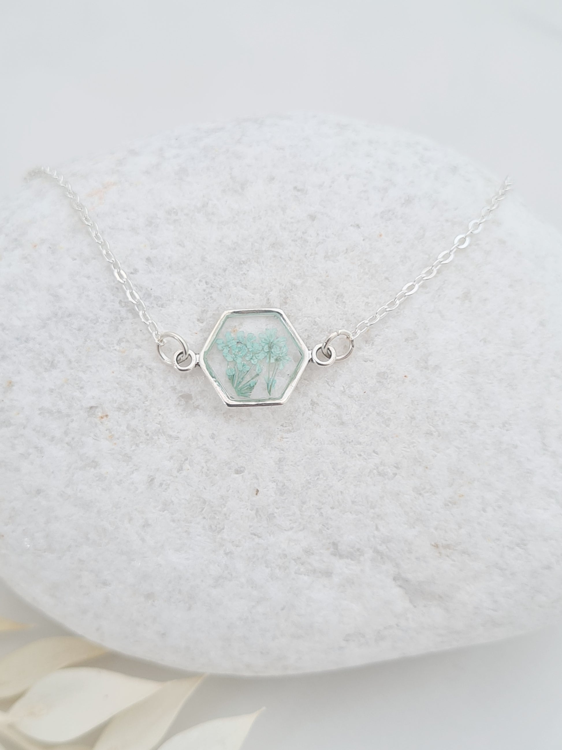 The flower is set in silver plated hexagon setting measuring 20mm in diameter (including the loops for the chain).