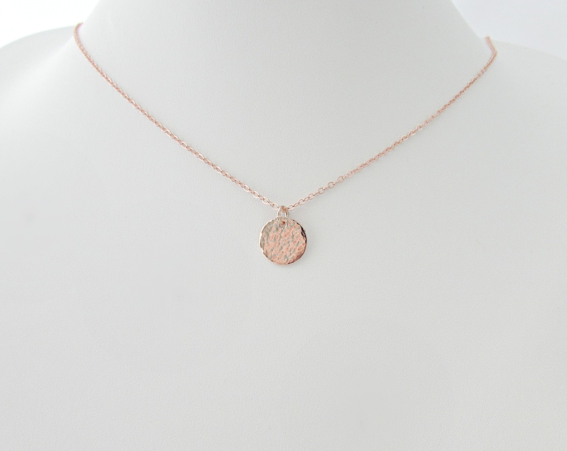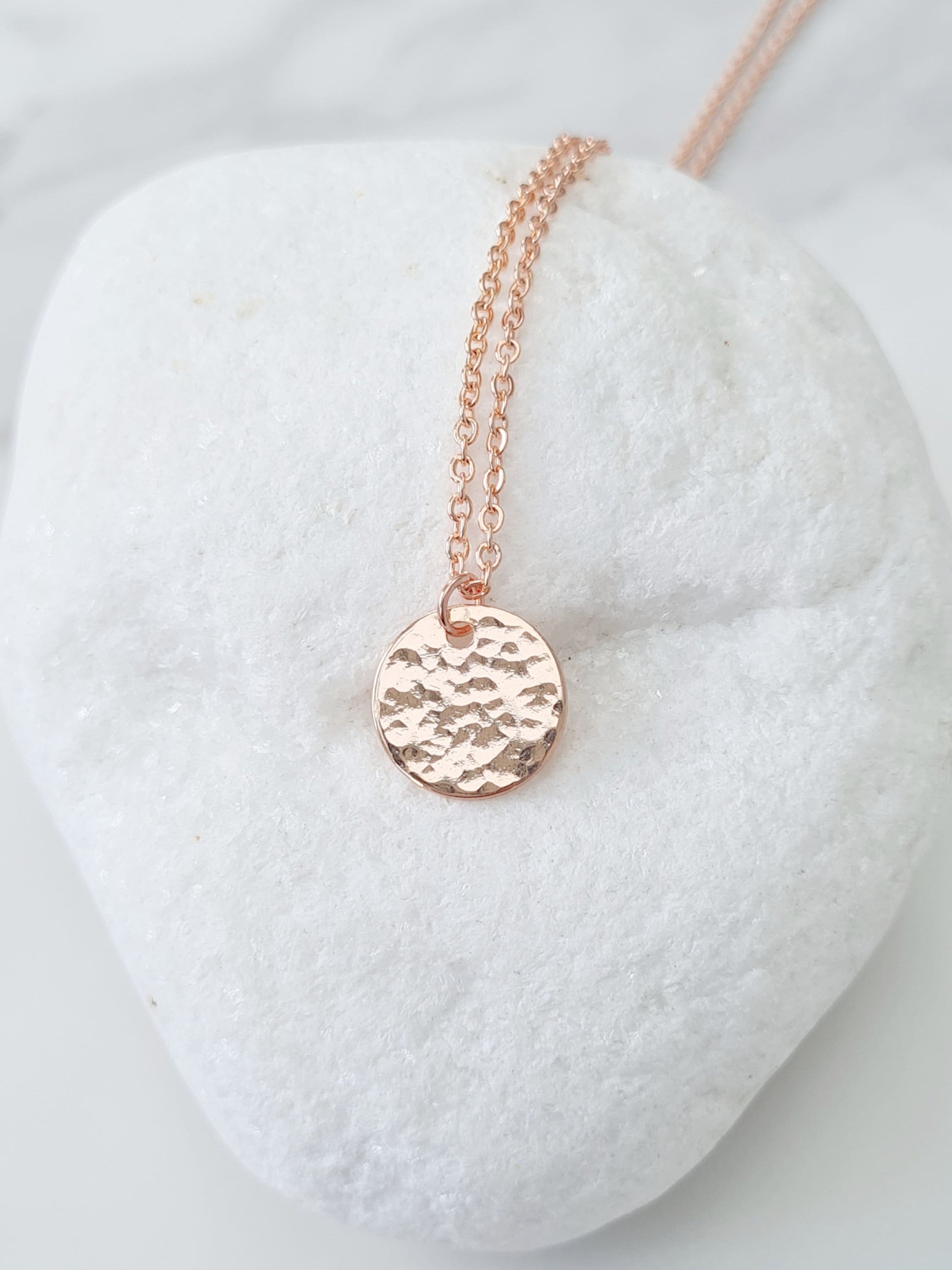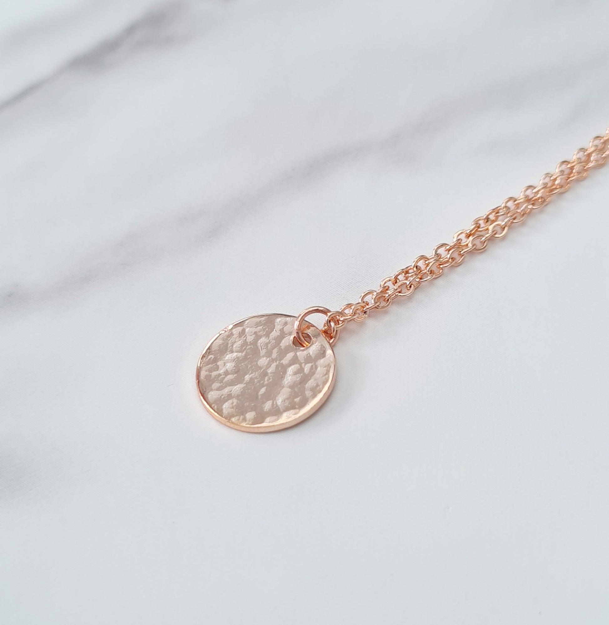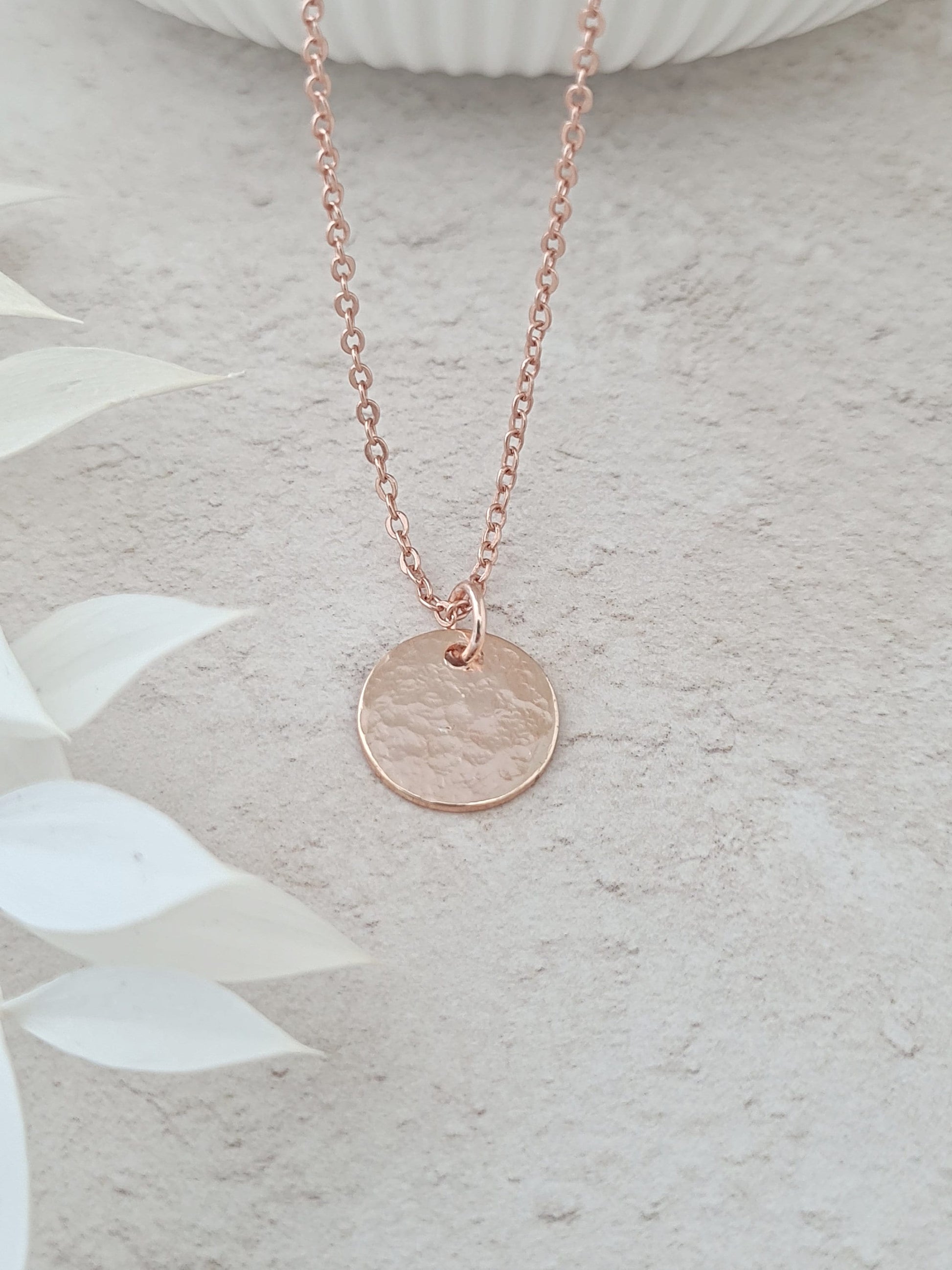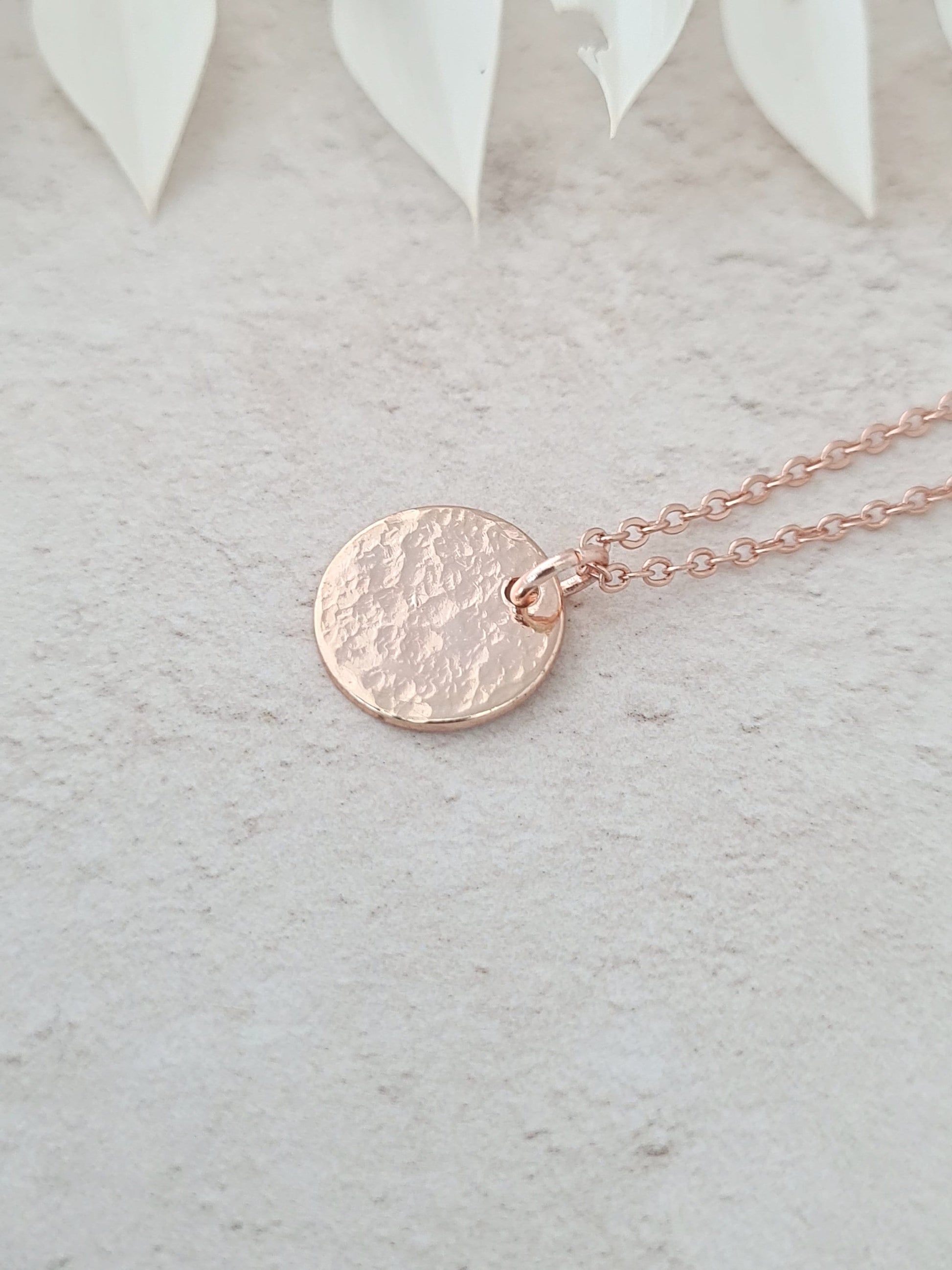 The disc is rose gold plated and hangs on a rose gold plated fine chain.