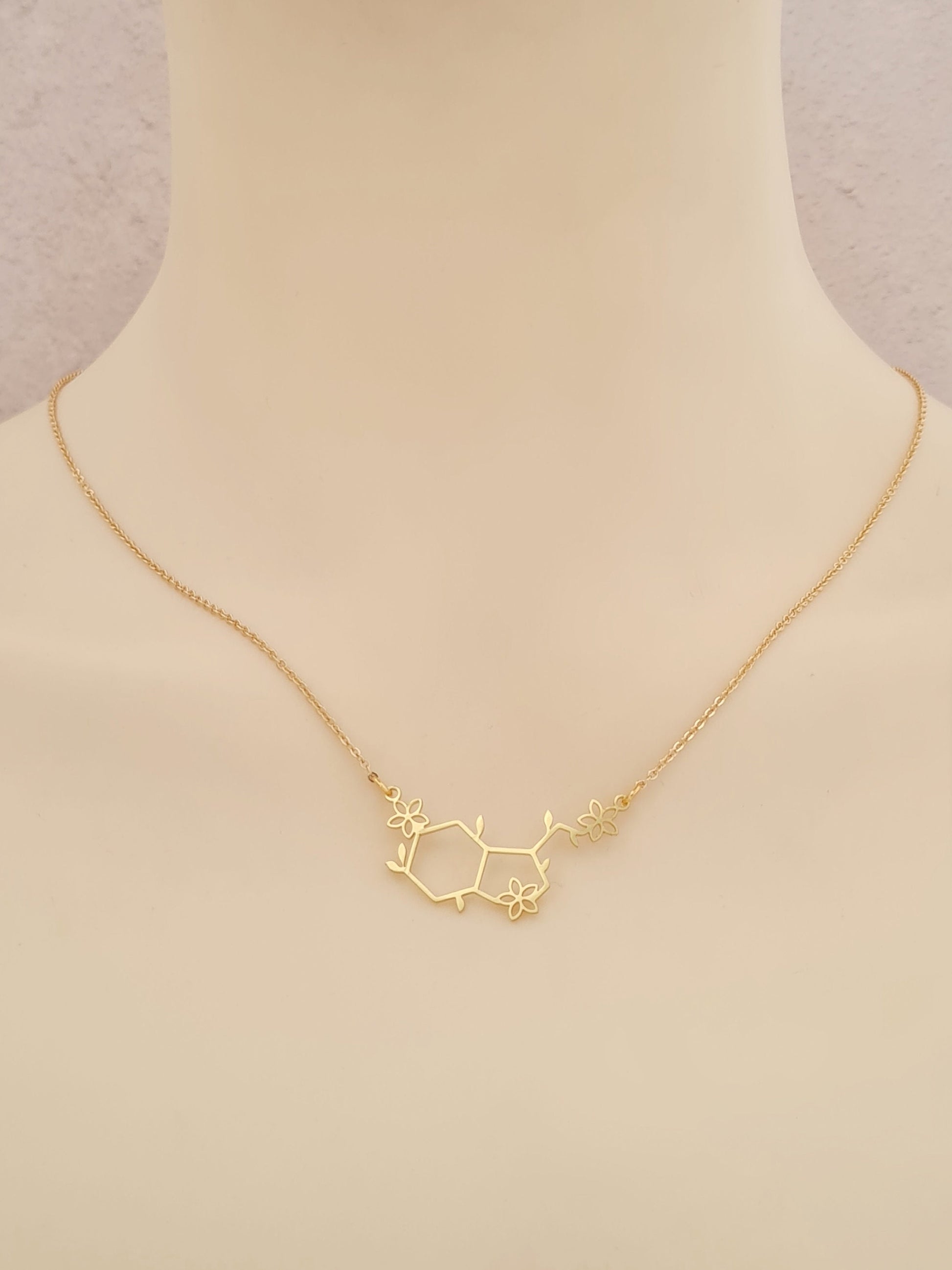Shiny gold stainless steel flower serotonin necklace, This pendant is made from stainless steel, which is non tarnish. The pendant measures 1.5in/3.5cm.