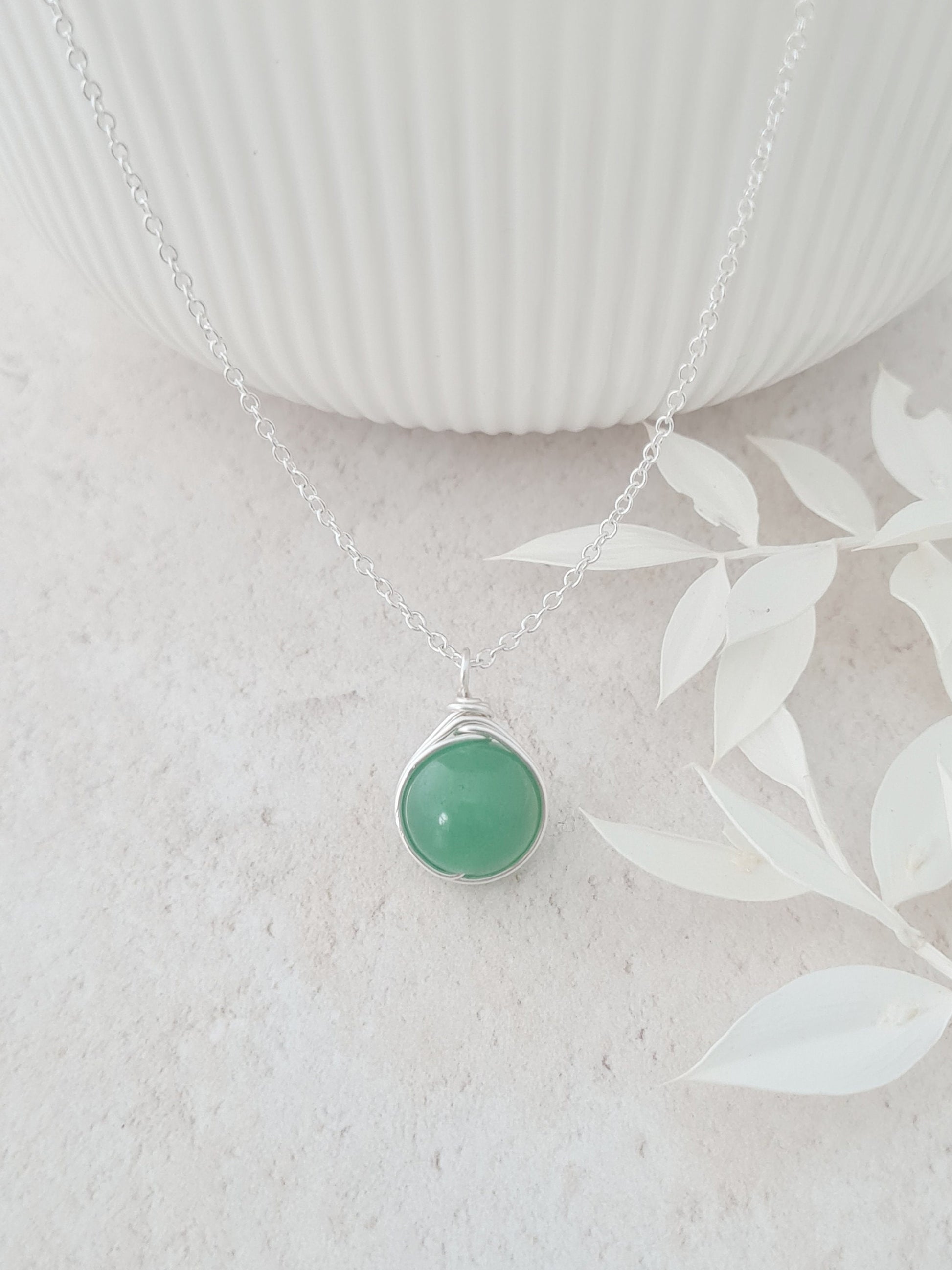 Pretty green jade pendant wrapped in silver plated wire and hangs on a sterling silver or silver plated fine chain.