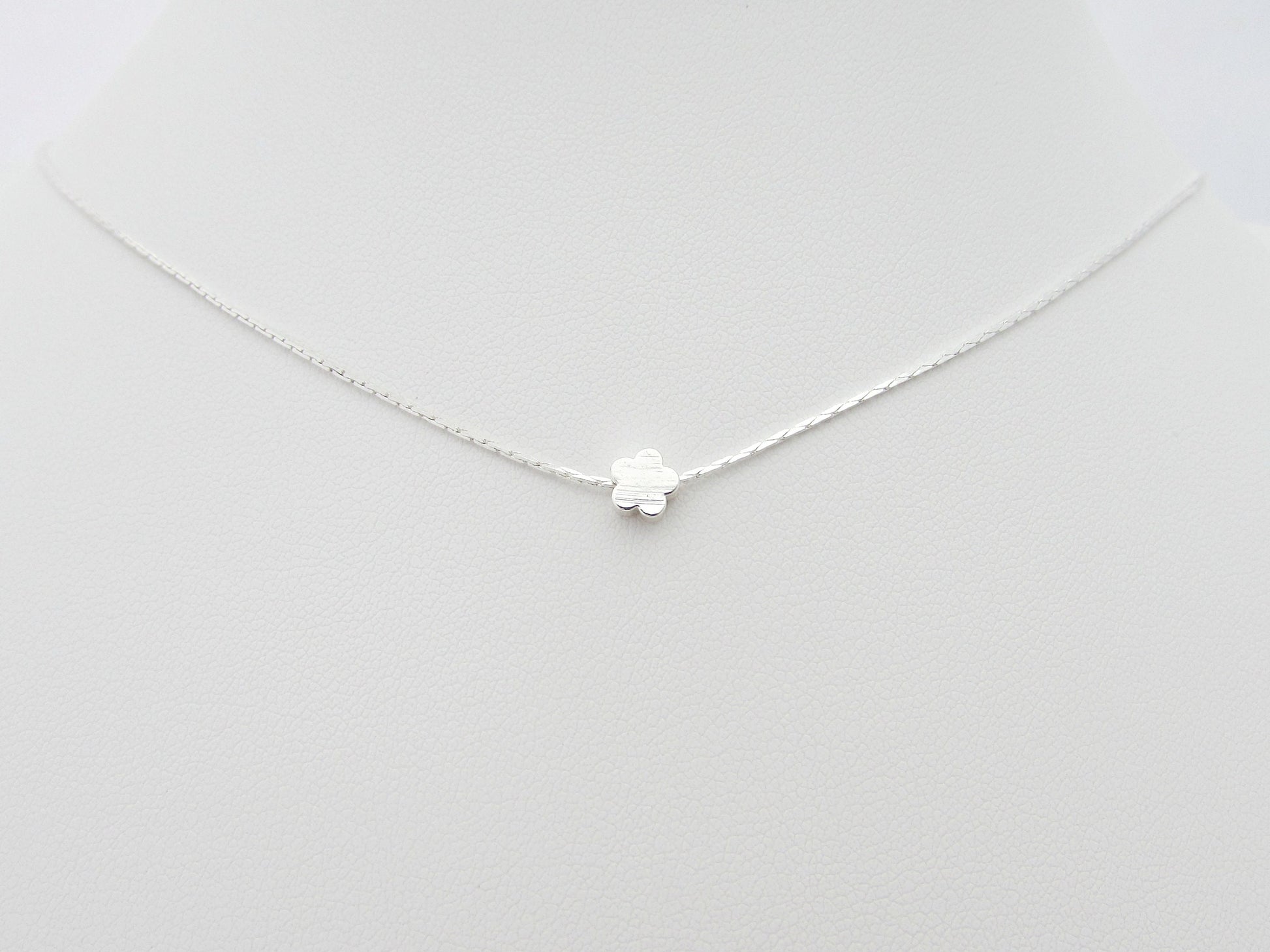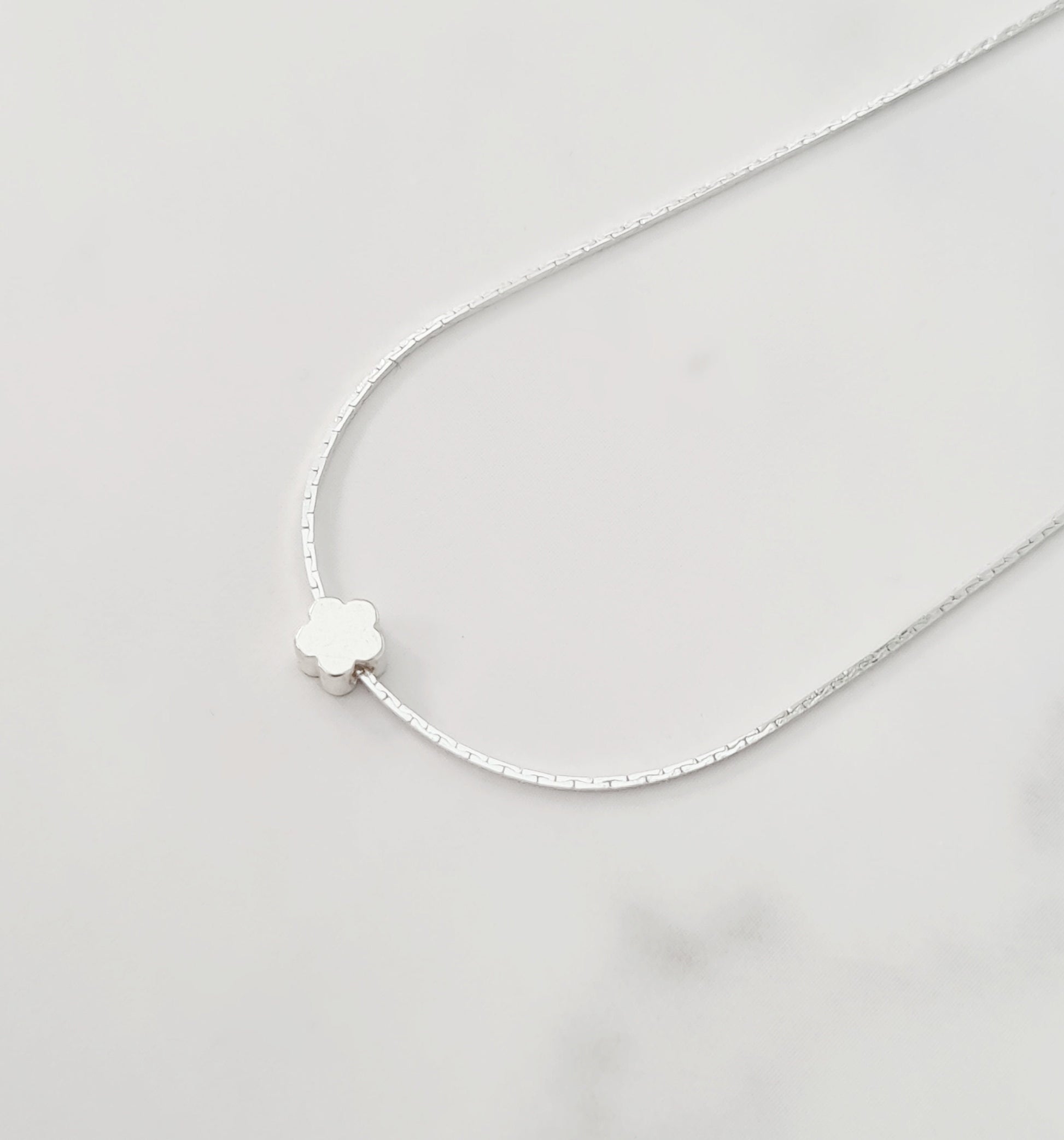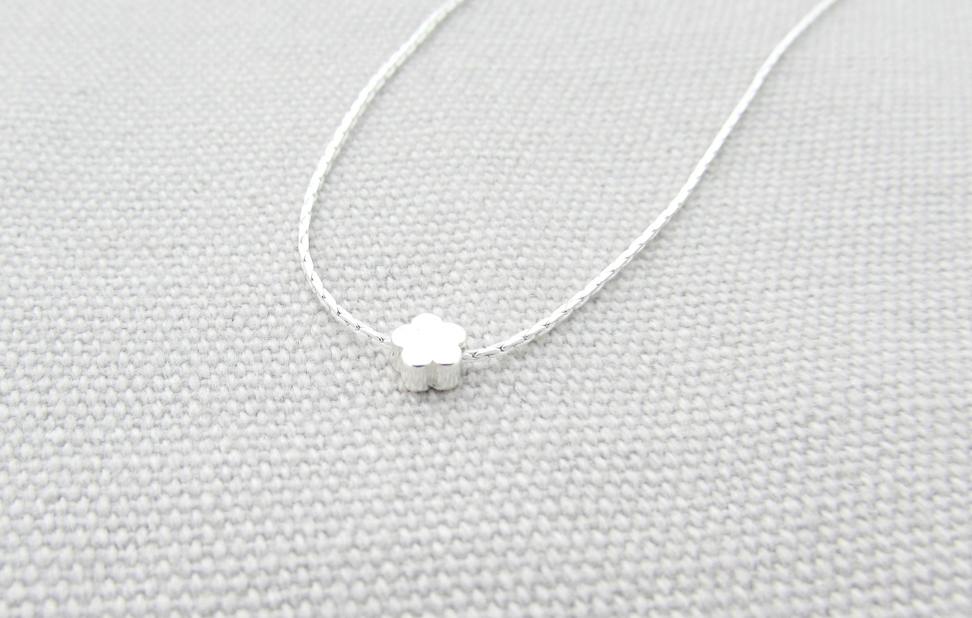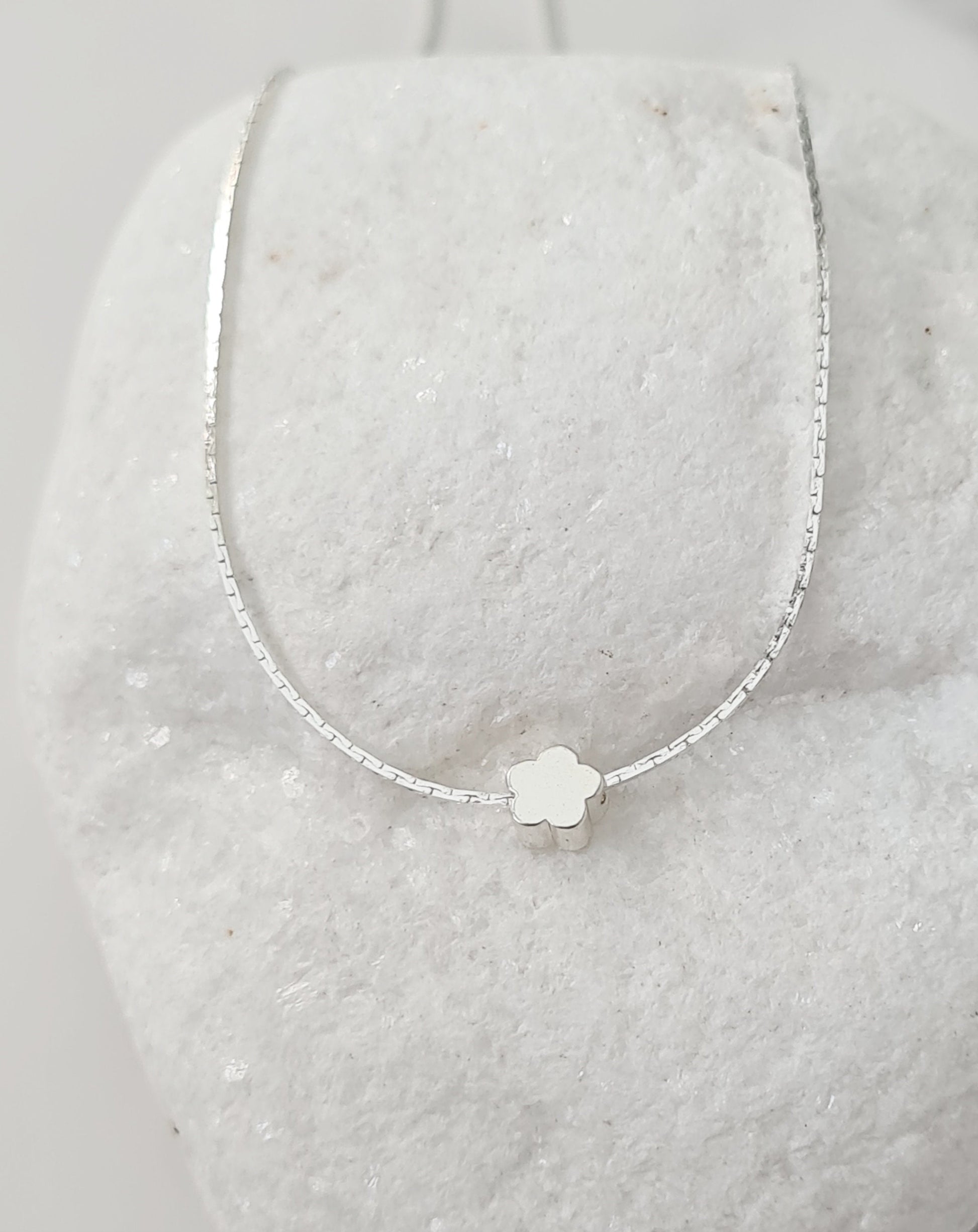 A tiny shiny flower hangs on silver plated snake chain. Dainty and pretty.