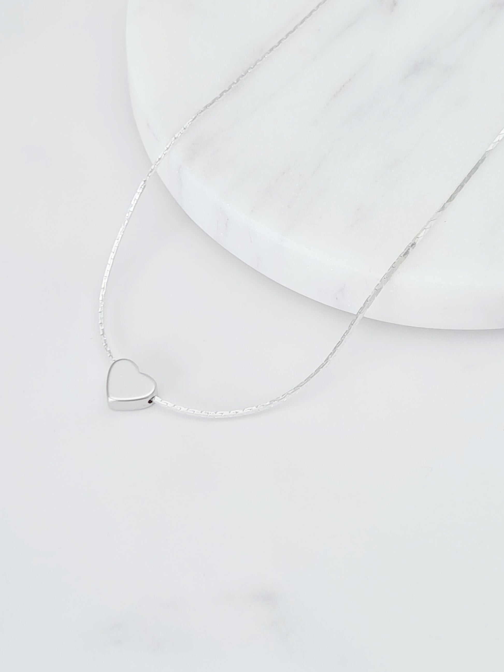 This necklace has a tiny matt silver rhodium plated (tarnish resistant) heart attached to a fine silver plated snake chain. Dainty necklace that can ben worn layered or on its own.