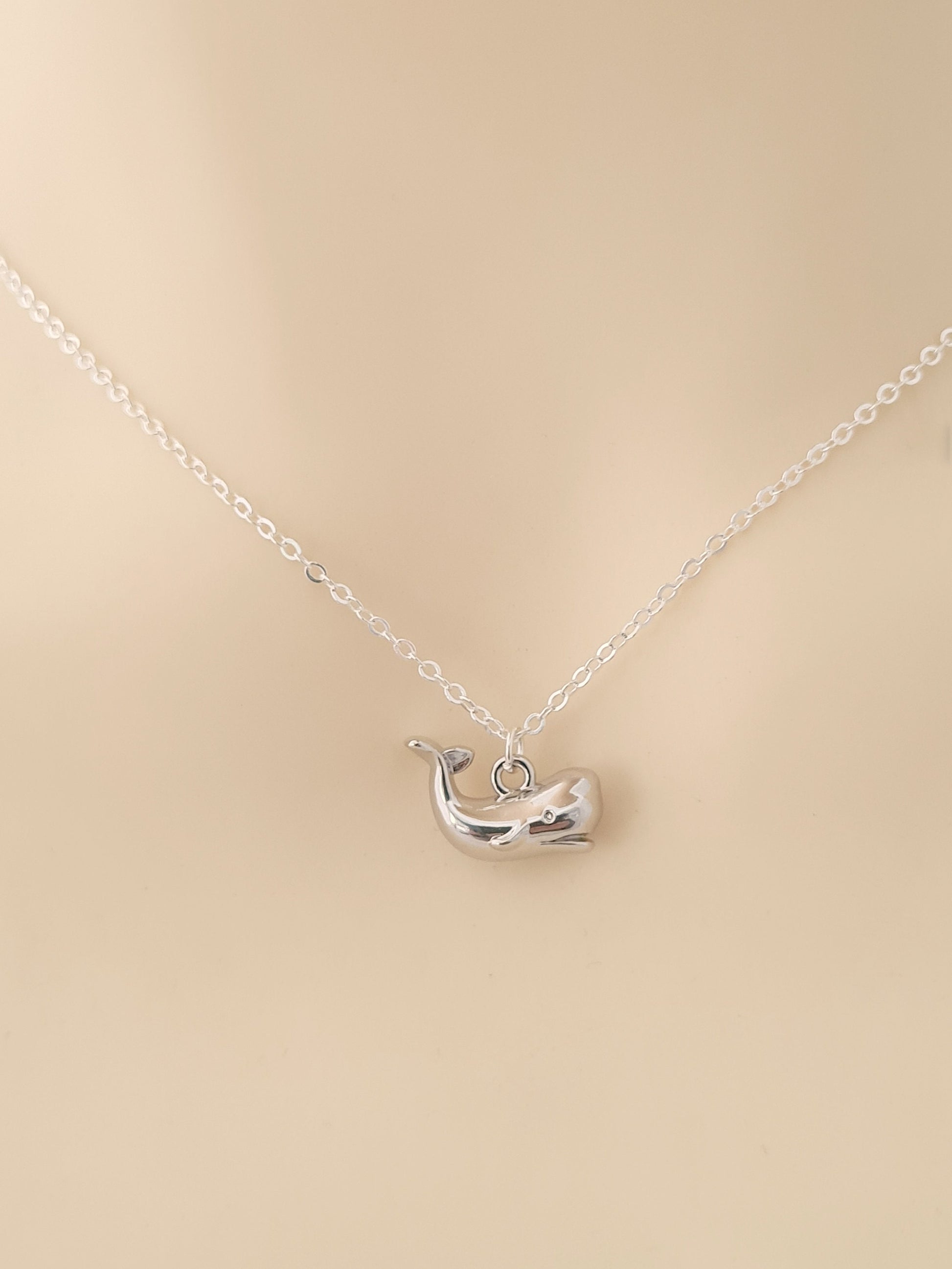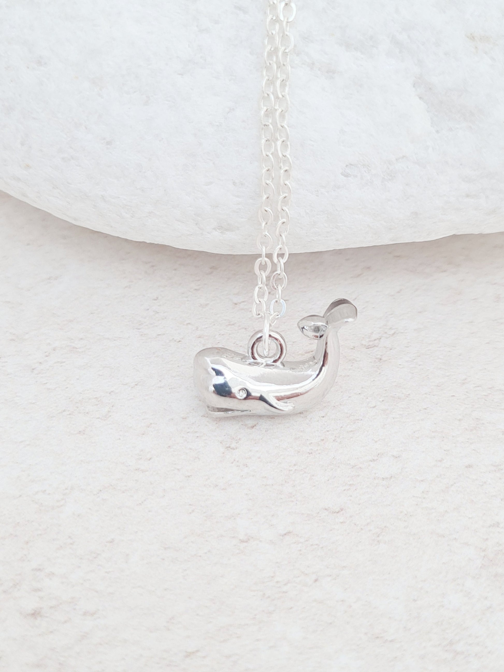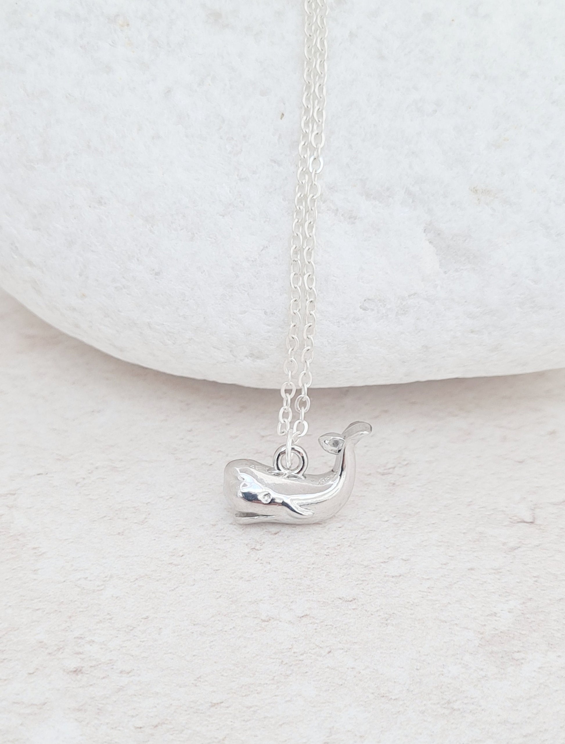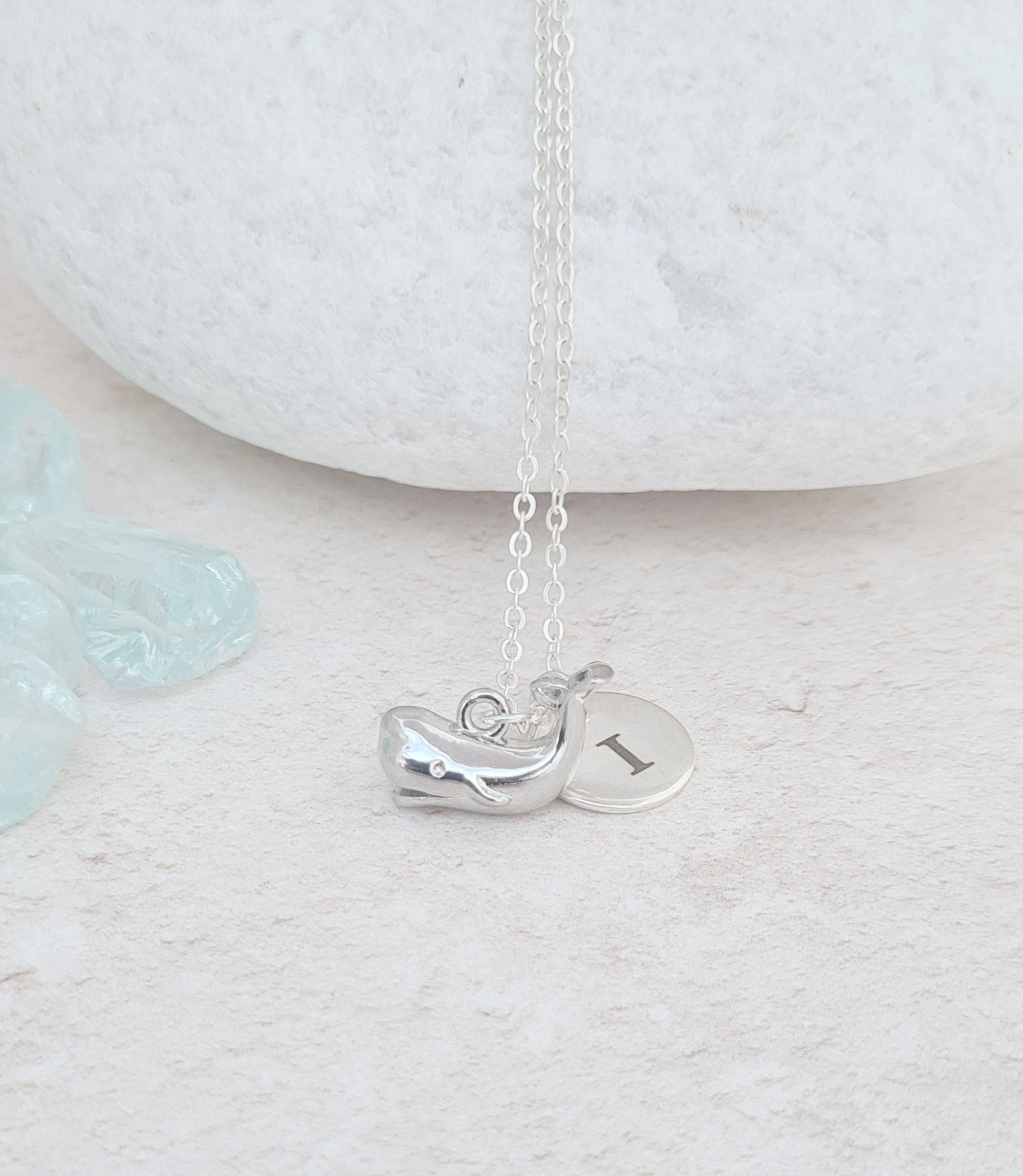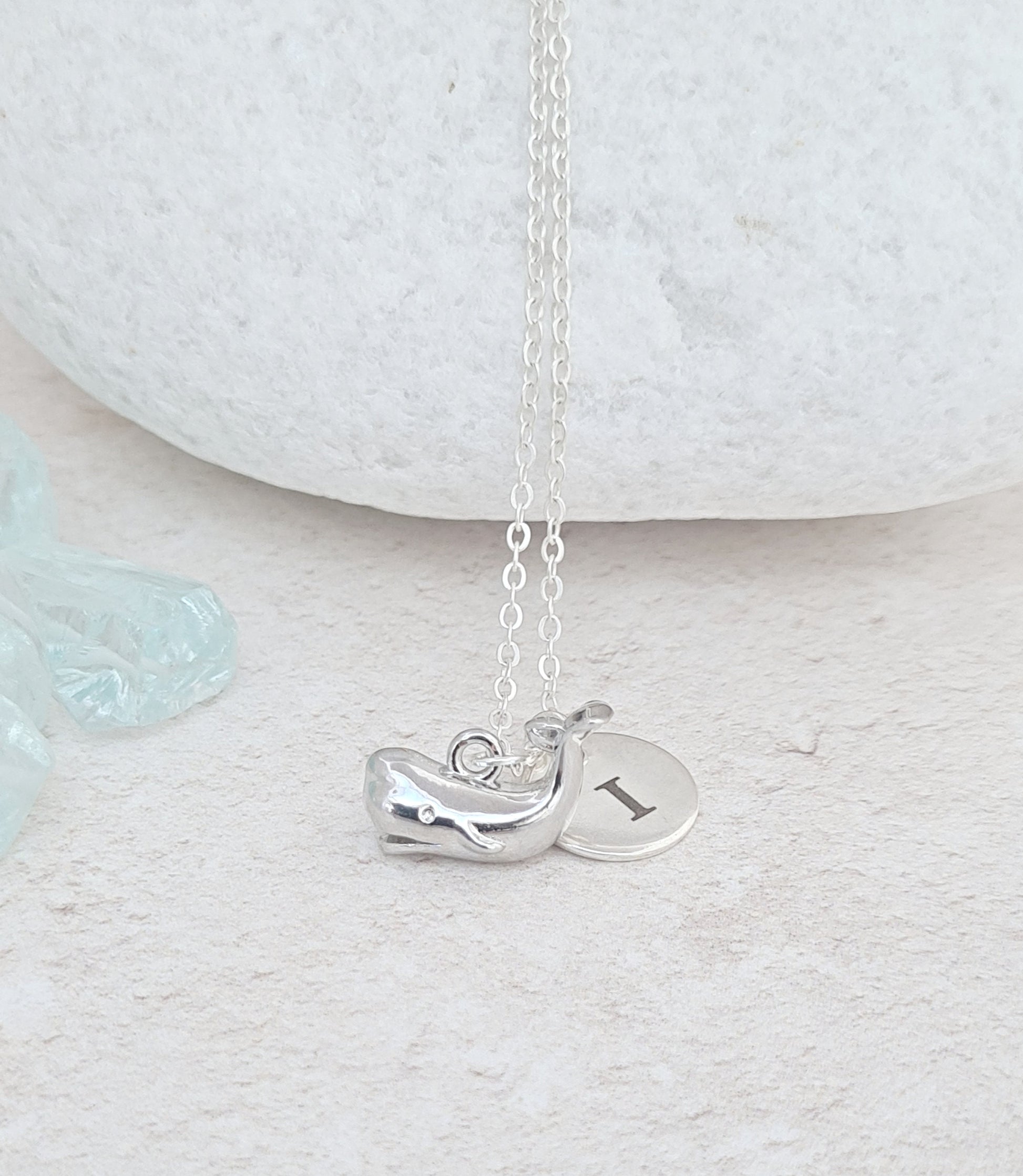 Personalised whale necklace. A shiny silver plated whale and engraved initial of your choice. The whale symbolises strength and a connection to the sea. Choose to have with or without the initial.